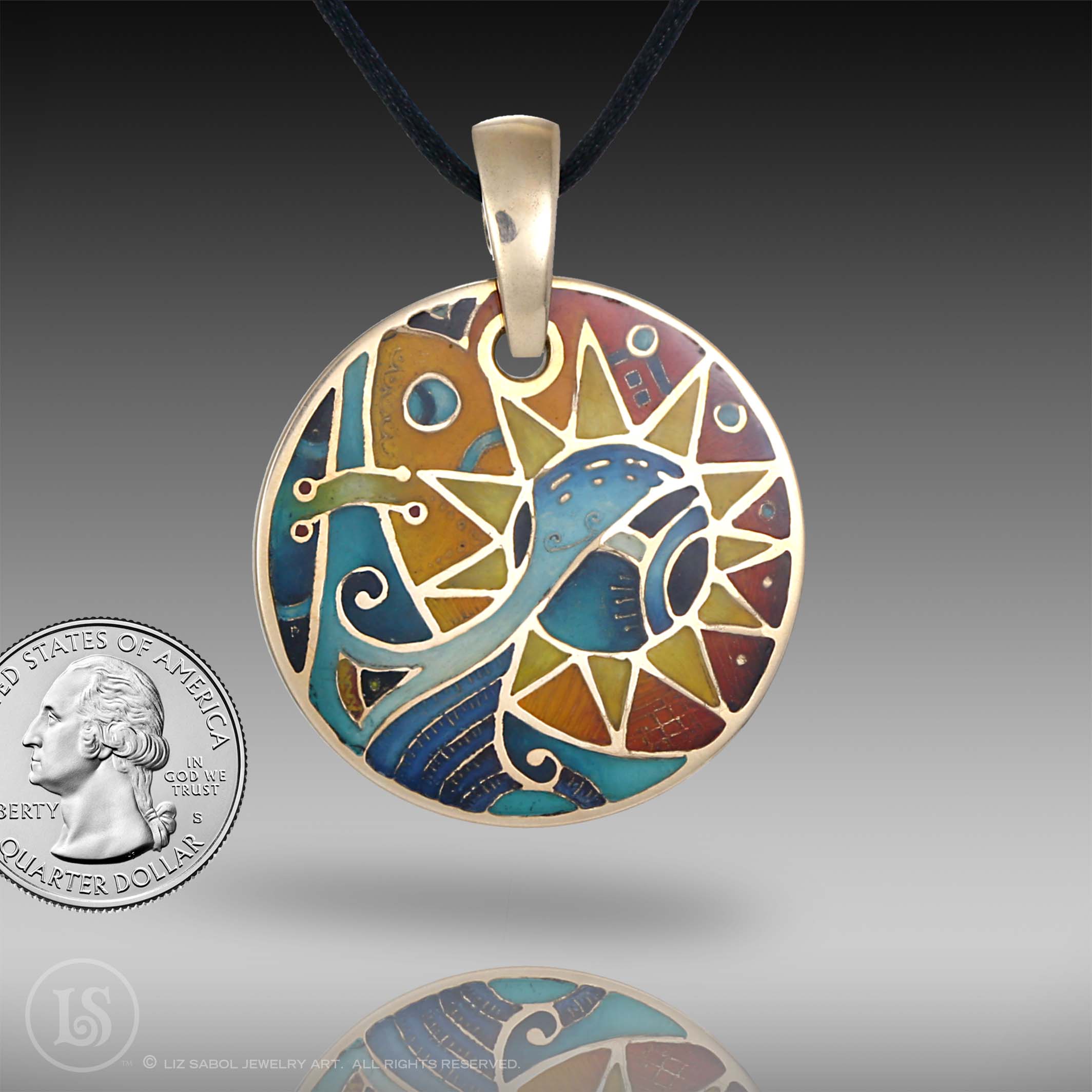 This bronze pendant is hand-crafted in bronze metal clay, hand-painted and filled with resin. The resin is sanded flush and re-polished.