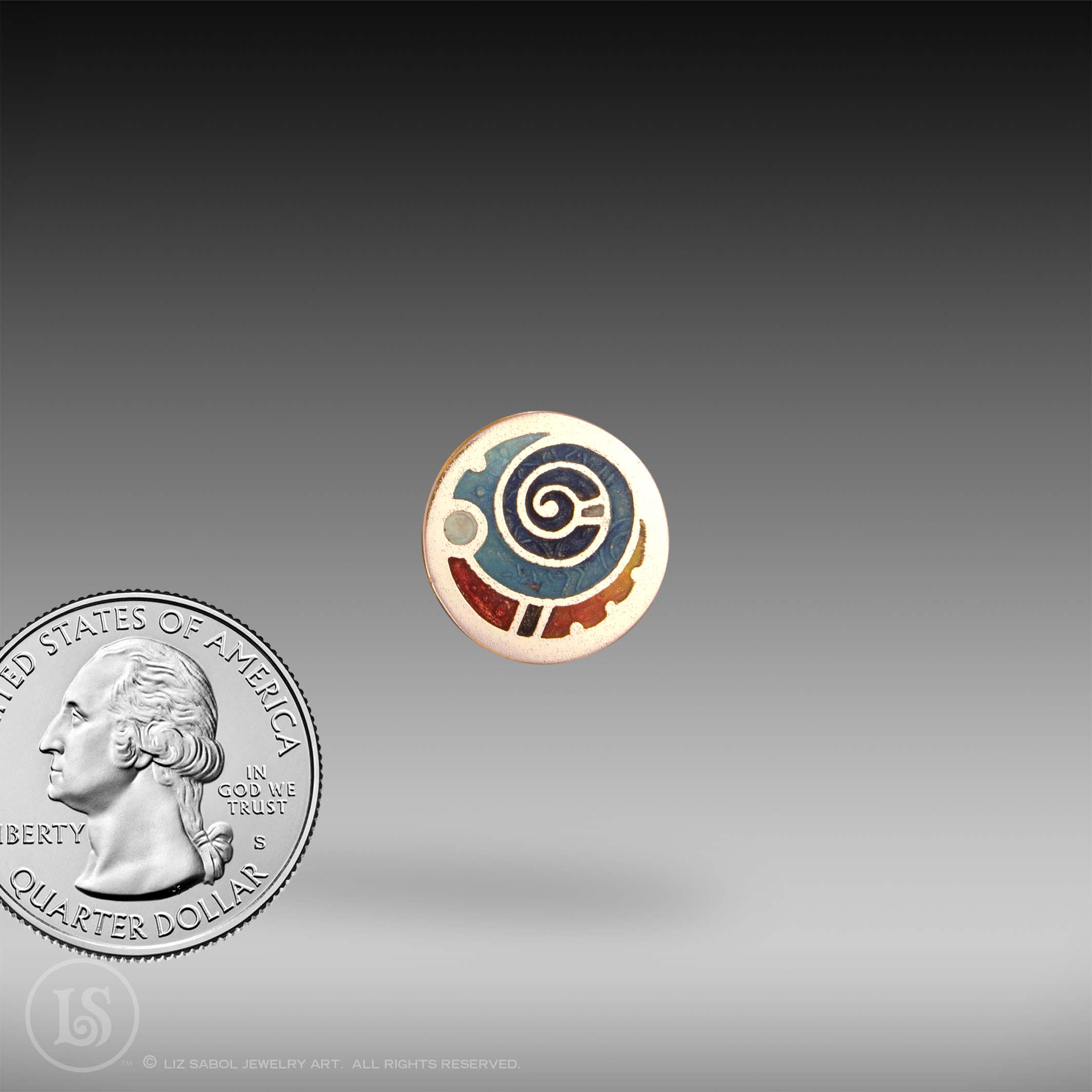 This bronze pin is hand-crafted in bronze metal clay, hand-painted and filled with resins. The resin is sanded flush and re-polished.