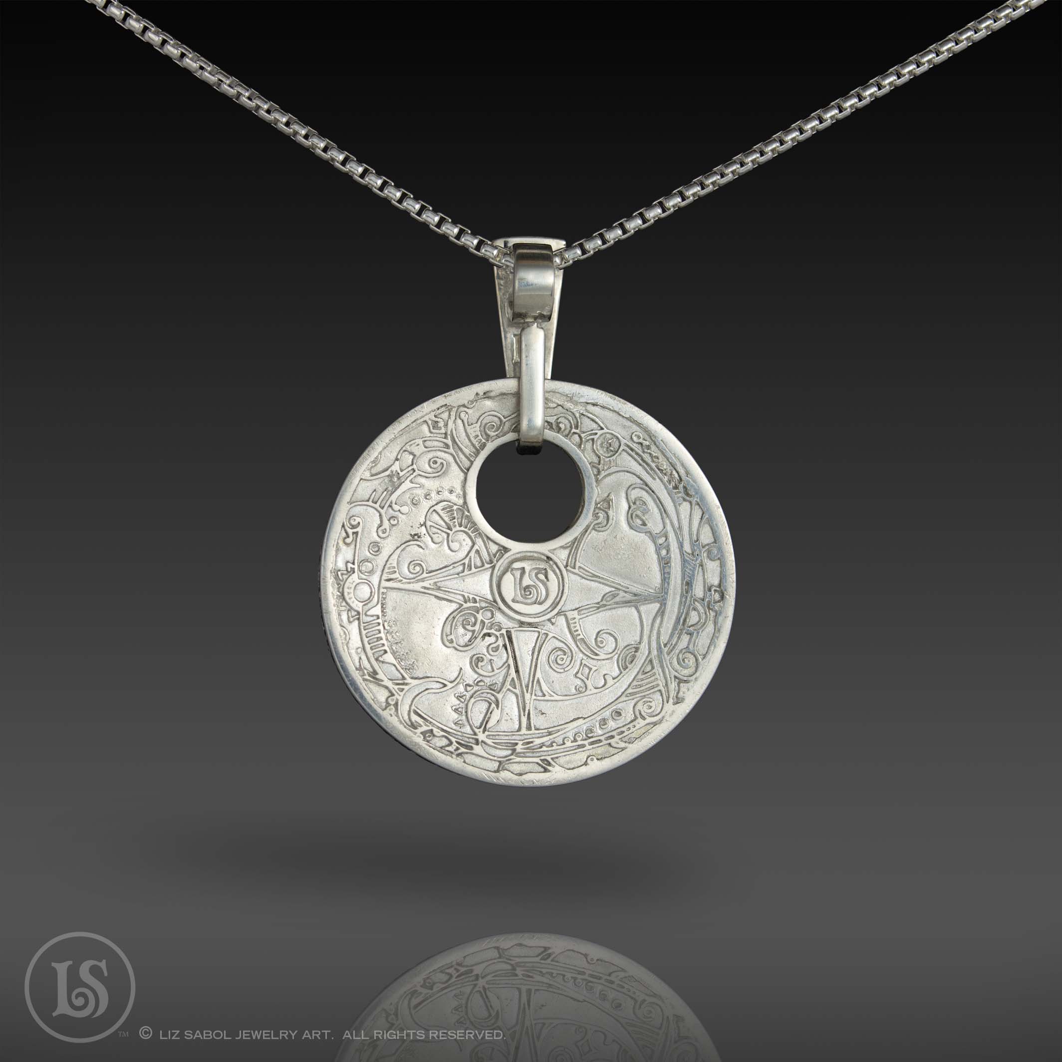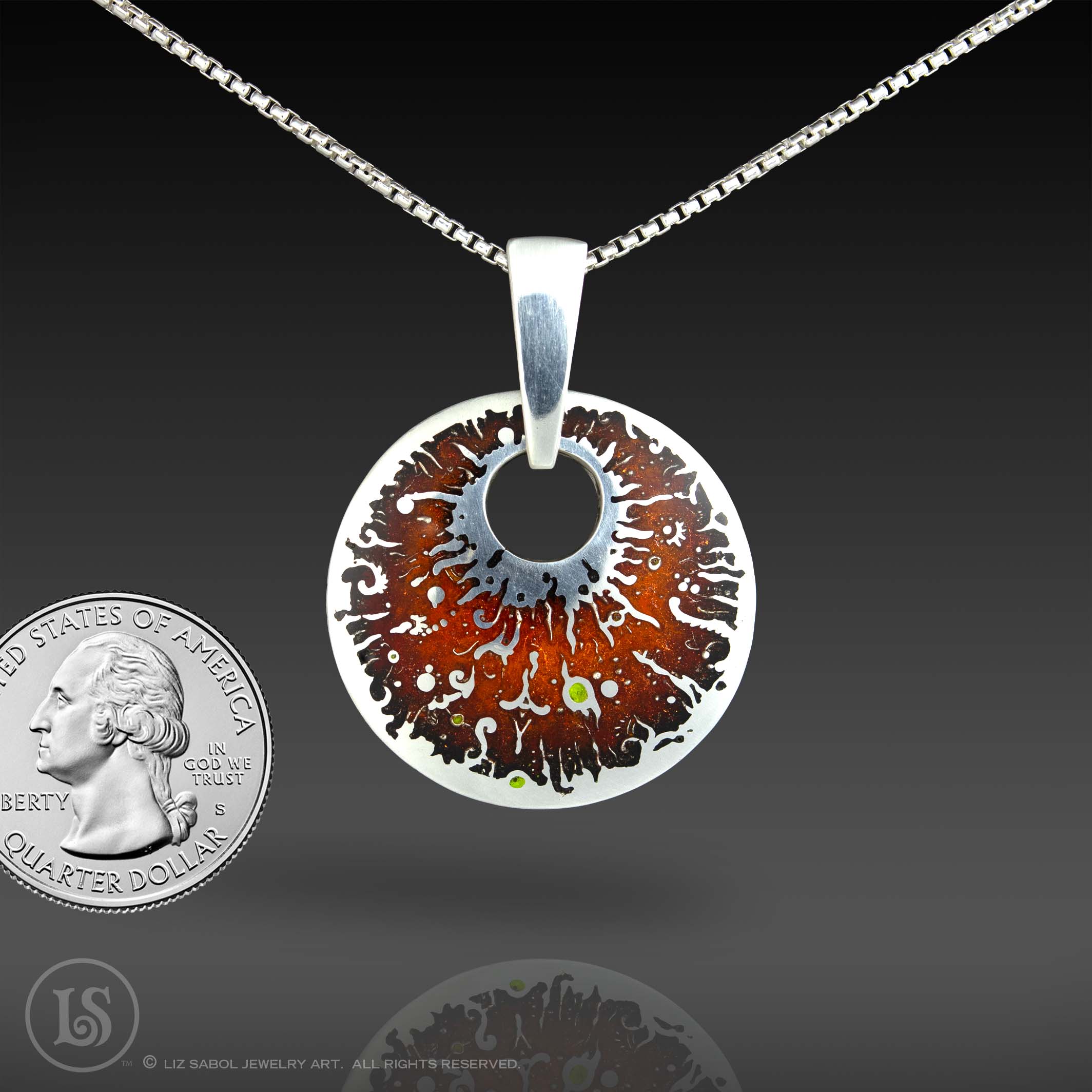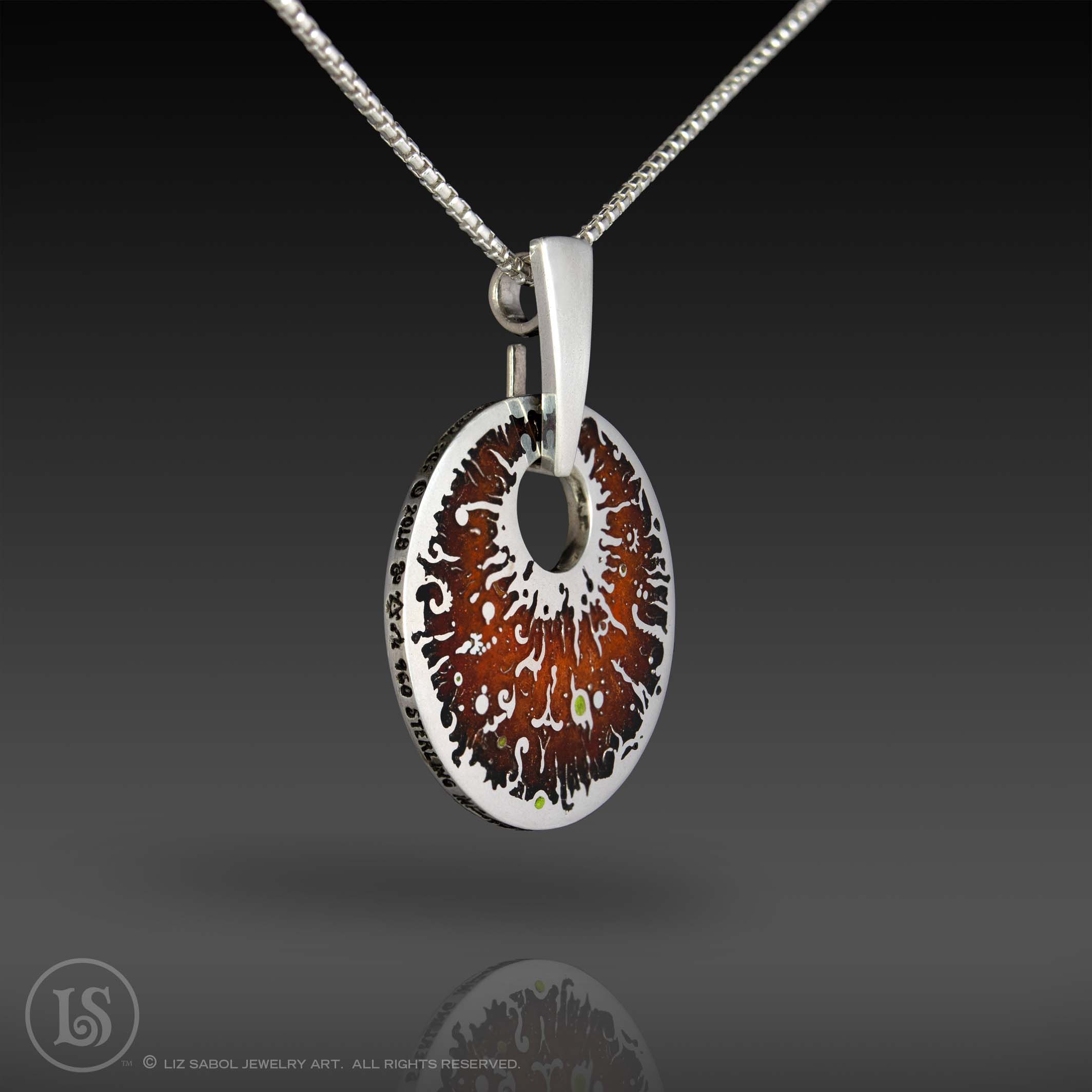 This pendant is hand-crafted in 960 sterling silver metal clay, hand-painted and filled with resin. The resin is sanded flush and re-polished.