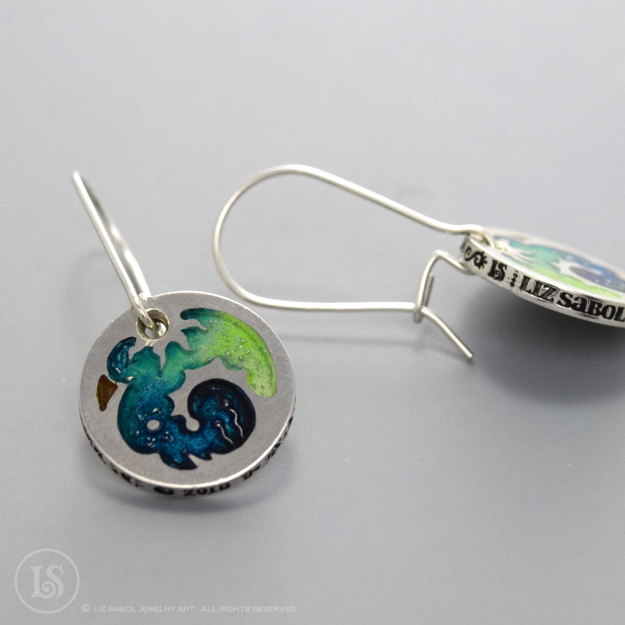 These earrings are hand-crafted in 960 sterling silver metal clay, hand-painted and filled with resin. The resin is sanded flush and re-polished.
