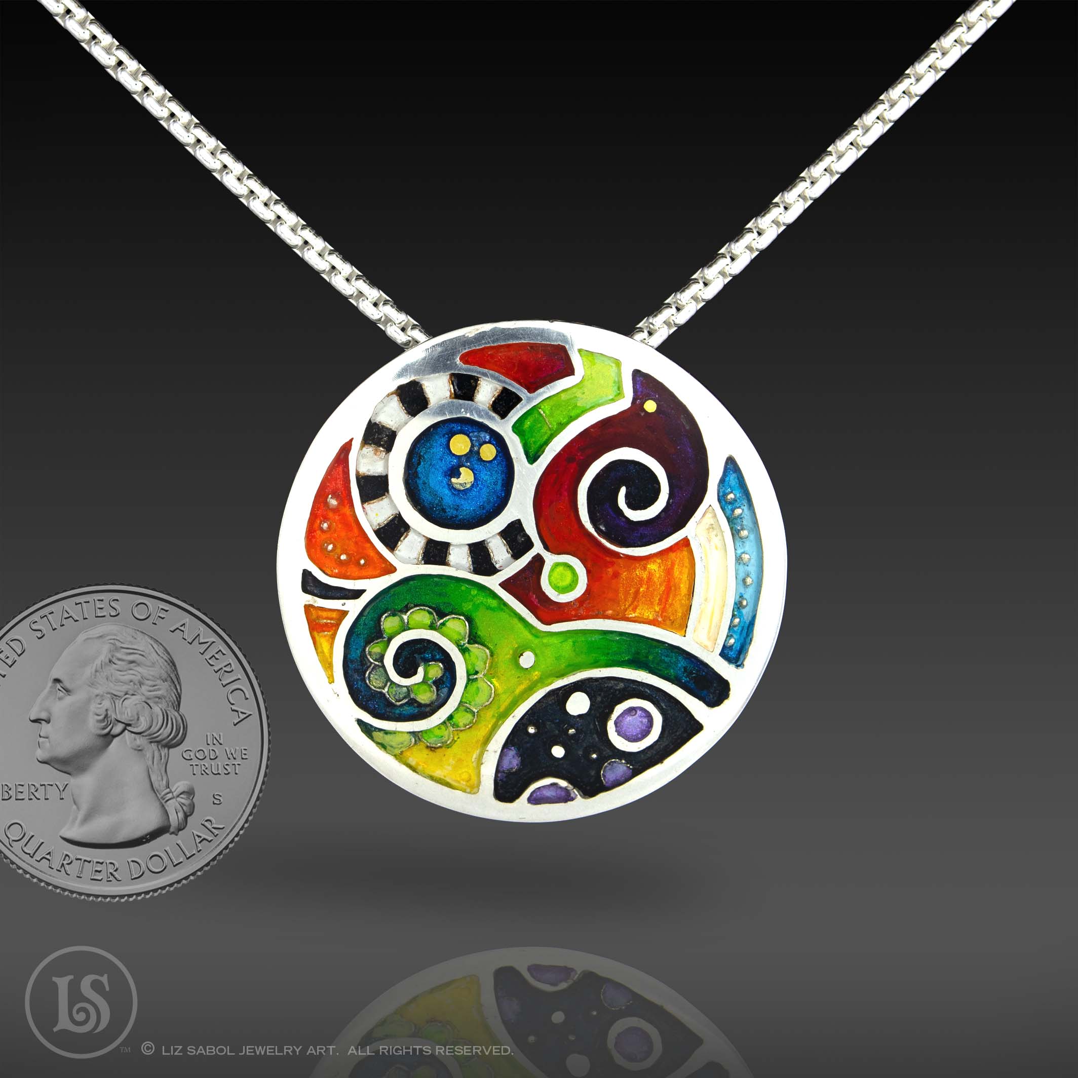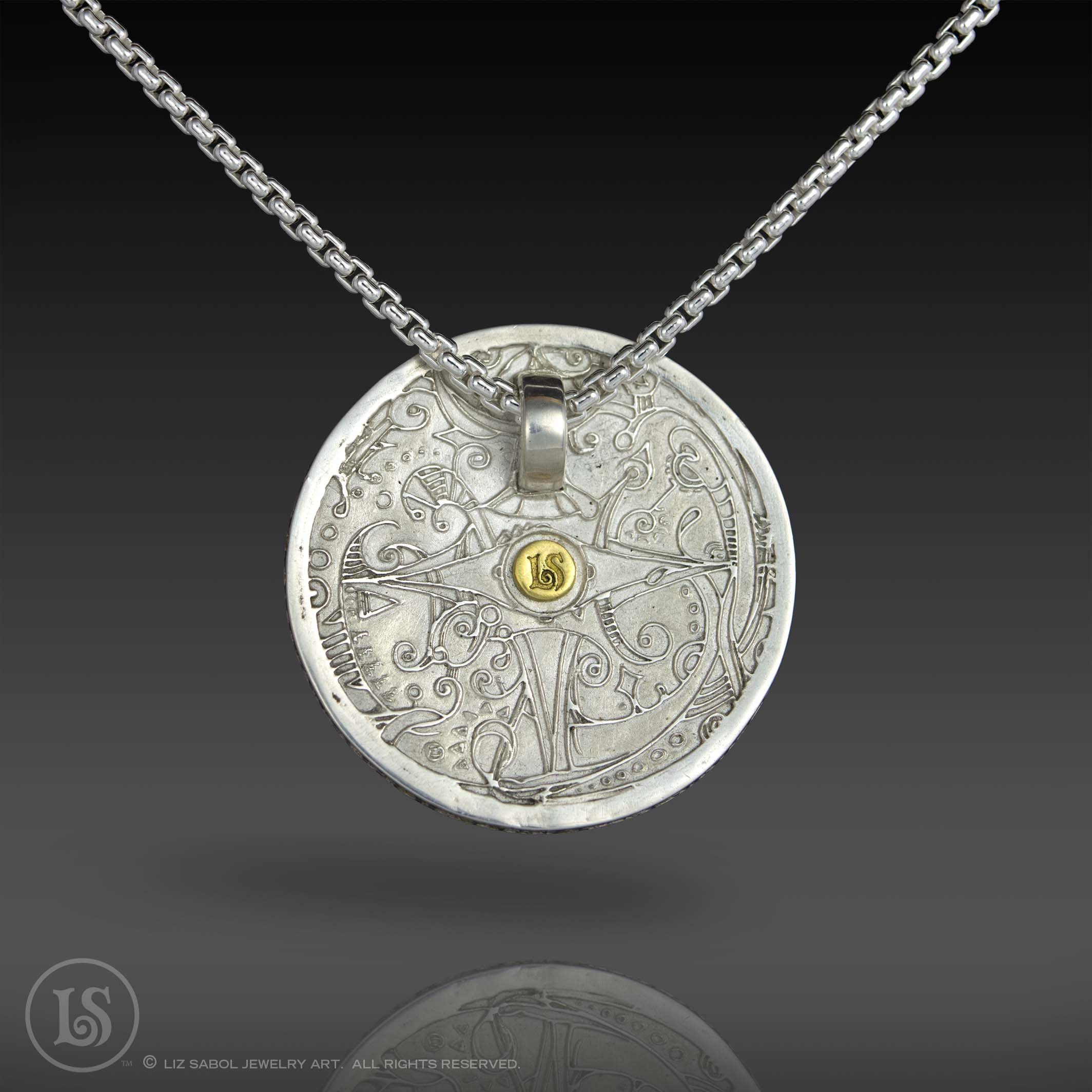 I made this pendant as a example piece for a master class I teach. It is hand-crafted in 960 sterling silver metal clay, 22K gold accent, hand-painted and filled with resin. The resin is sanded flush and re-polished.