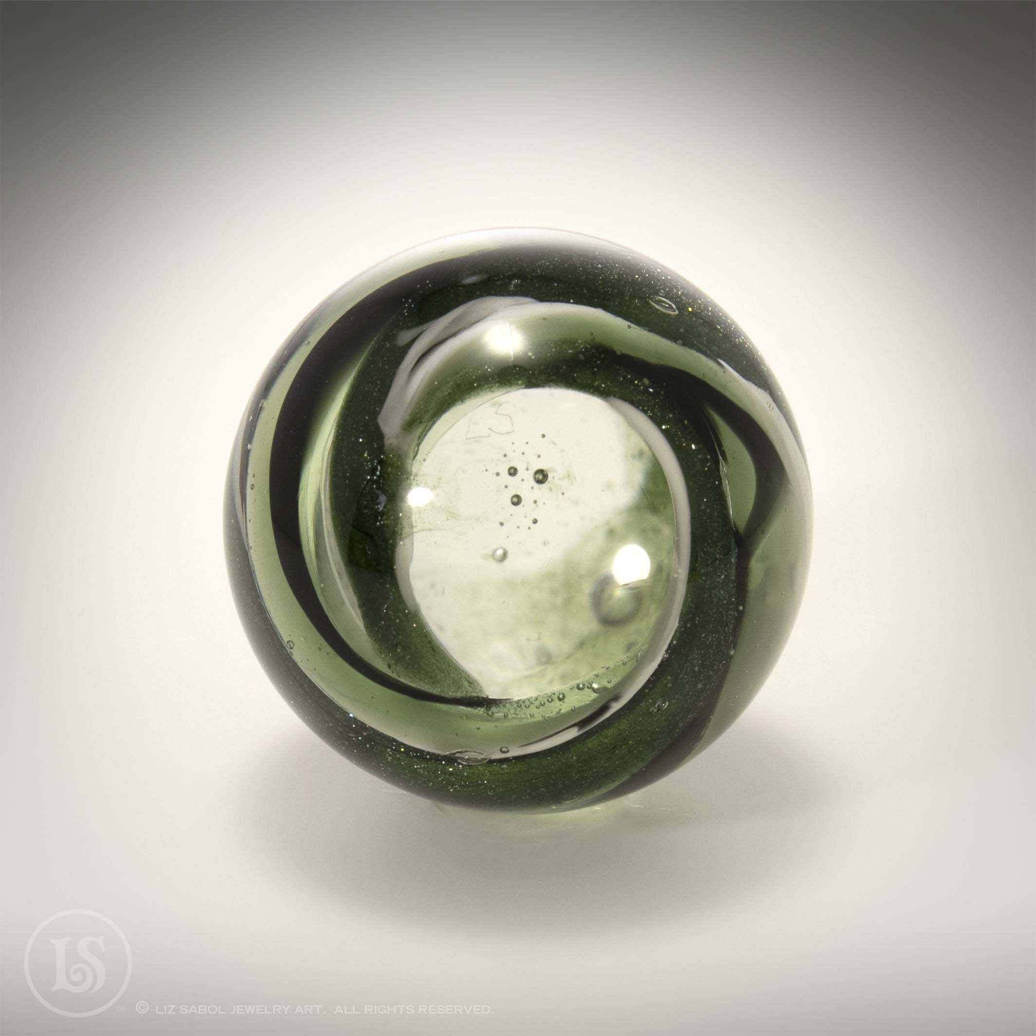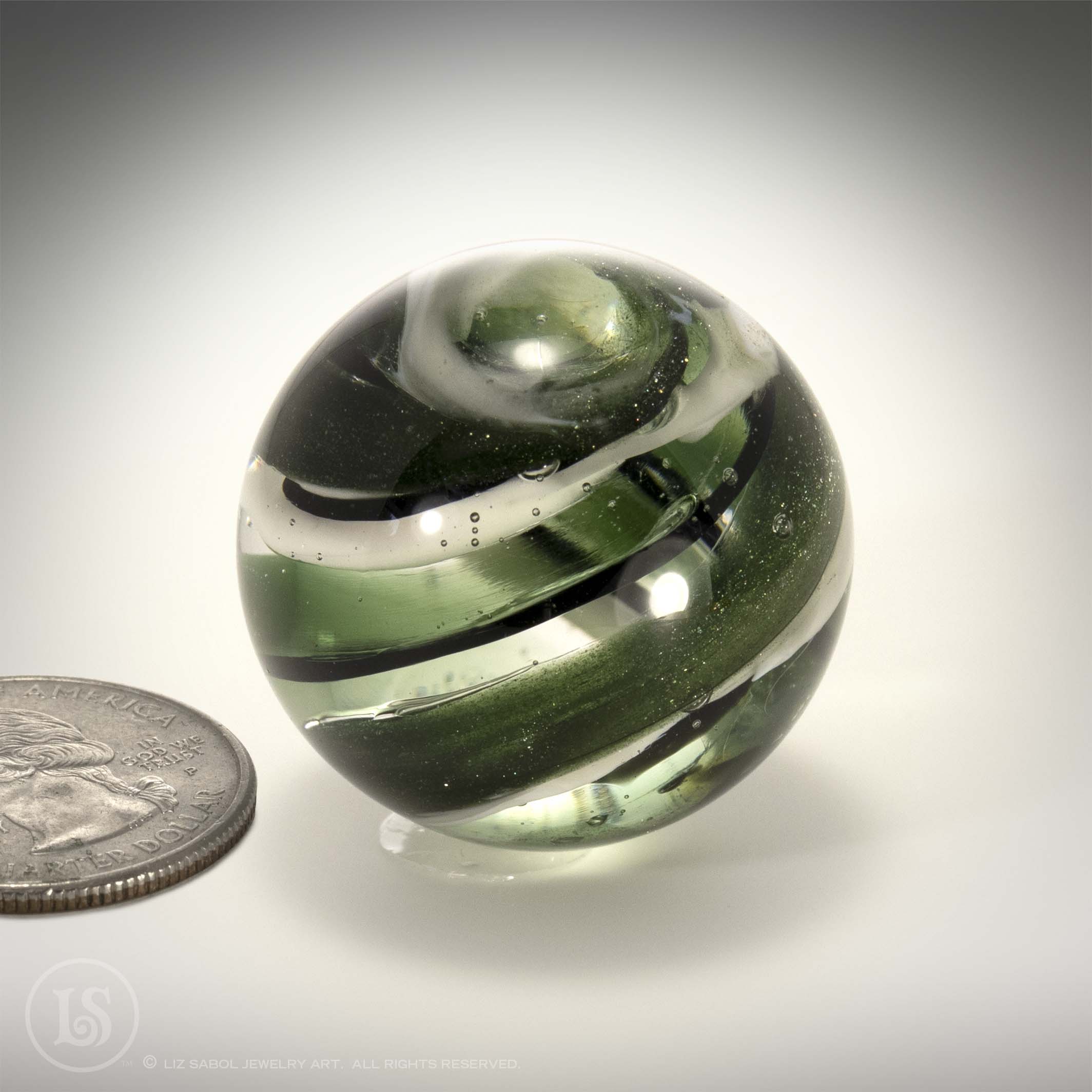 Hand-made one-of-a-kind lampworked glass marble. Signed LS on the bottom with titanium pen. A simple plastic stand is included. Hand-made bronze stands are available for purchase.