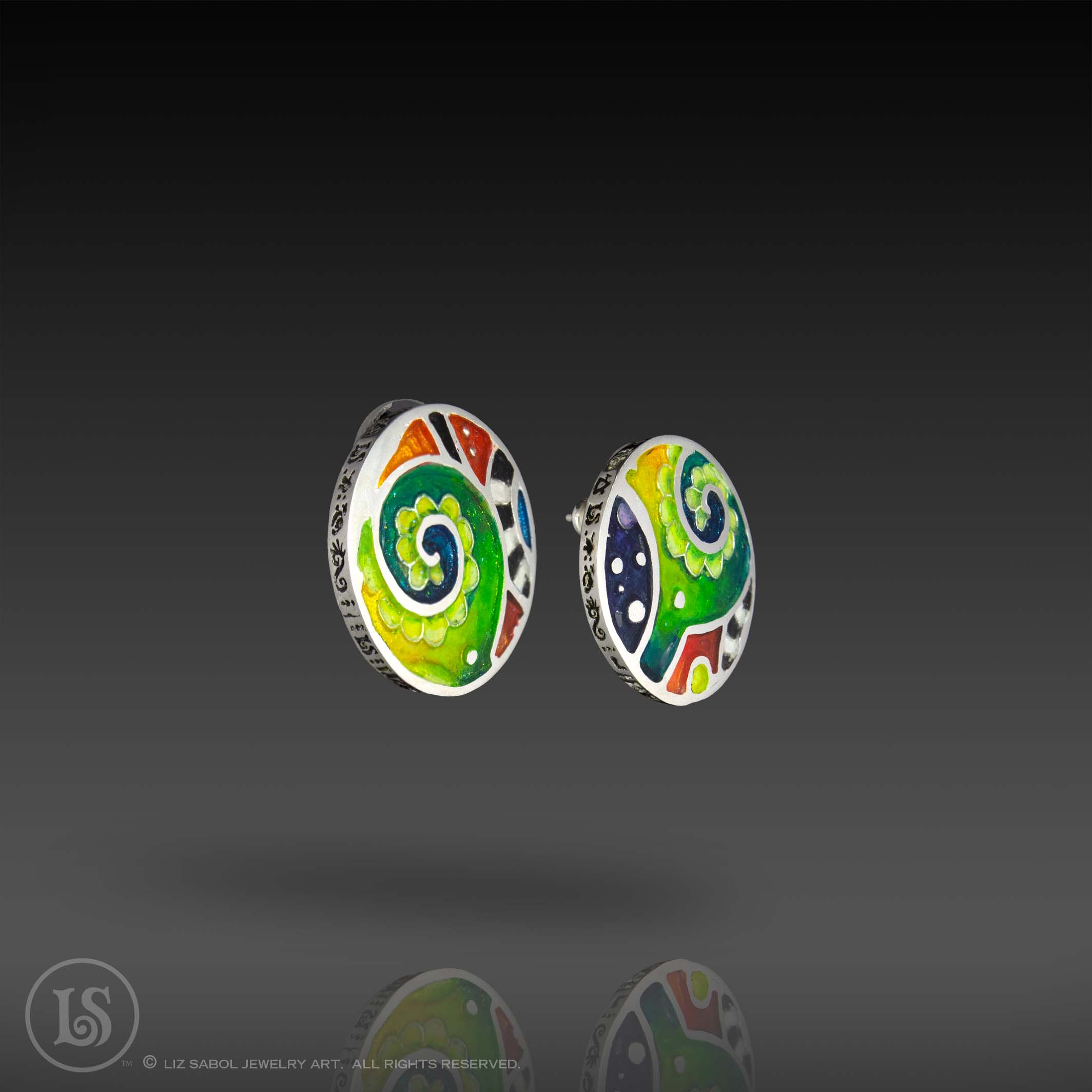 I made these earrings as an example for a master class I teach. It is hand-crafted in 960 sterling silver metal clay, 22K gold accents, hand-painted and filled with resin. The resin is sanded flush and re-polished.