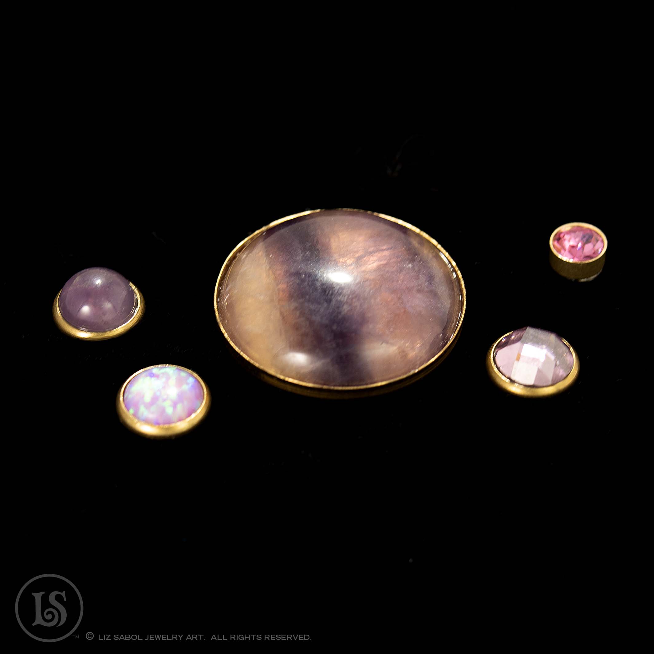 Handmade magnets with gemstones. Flourite, Amethyst, cultured opal, cubic zirconia, Swarovski crystal, set in brass bezels. Sizes: 25mm Flourite, 8mm Amethyst, 8mm cultured opal, 8mm cubic zirconia, 6mm Swarovski crystal.