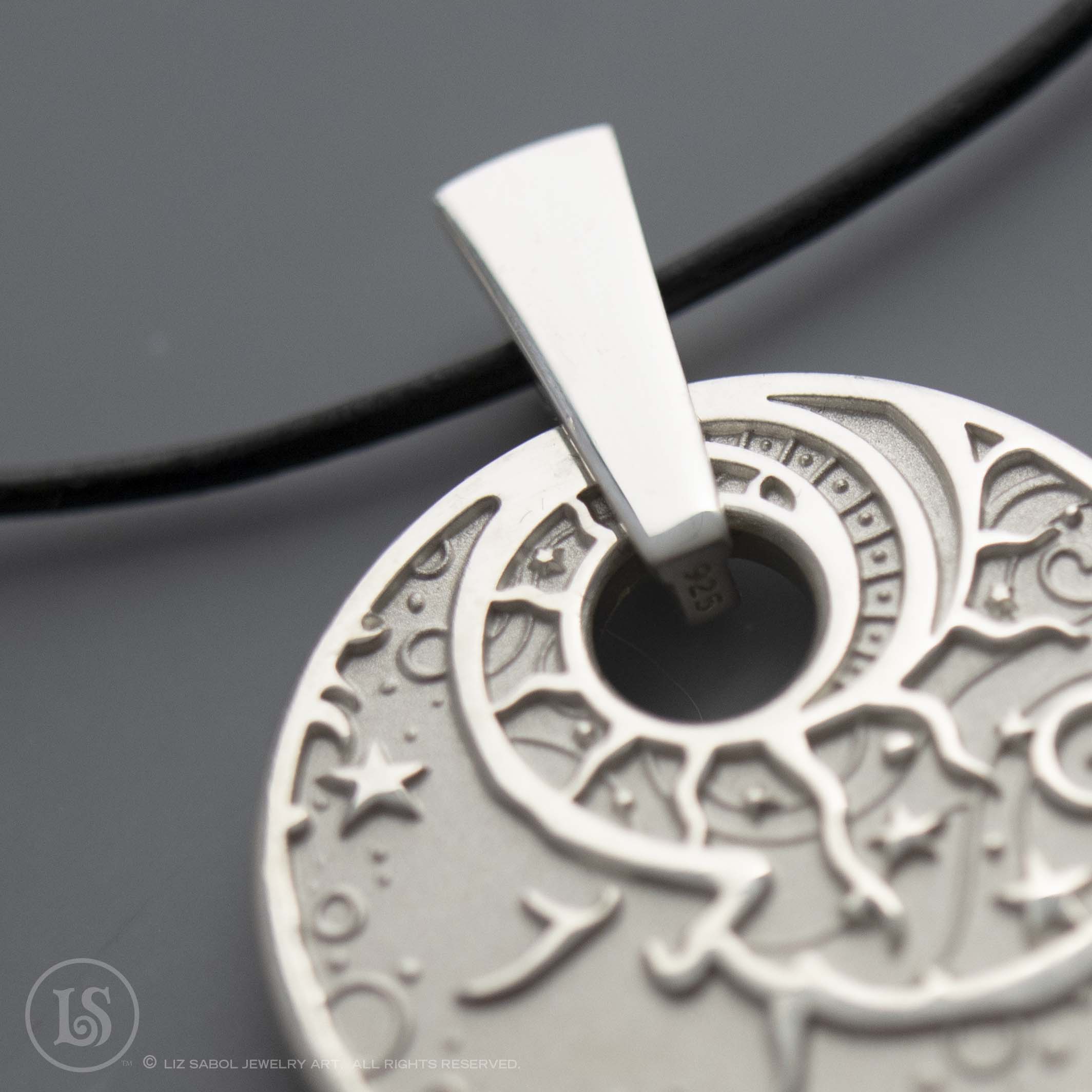 Solid sterling silver pendant with my Celestial Man in the Moon design in deep relief. Sterling bail and 20" Leather cord included. Polishing cloth included. Other lengths available by request.