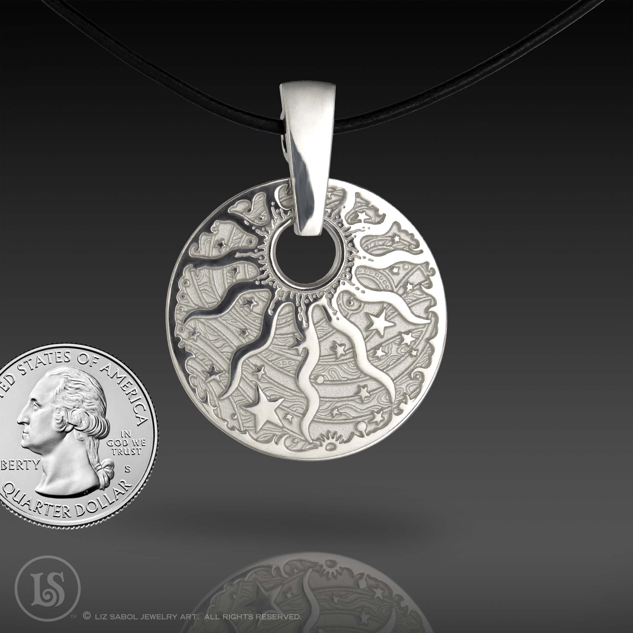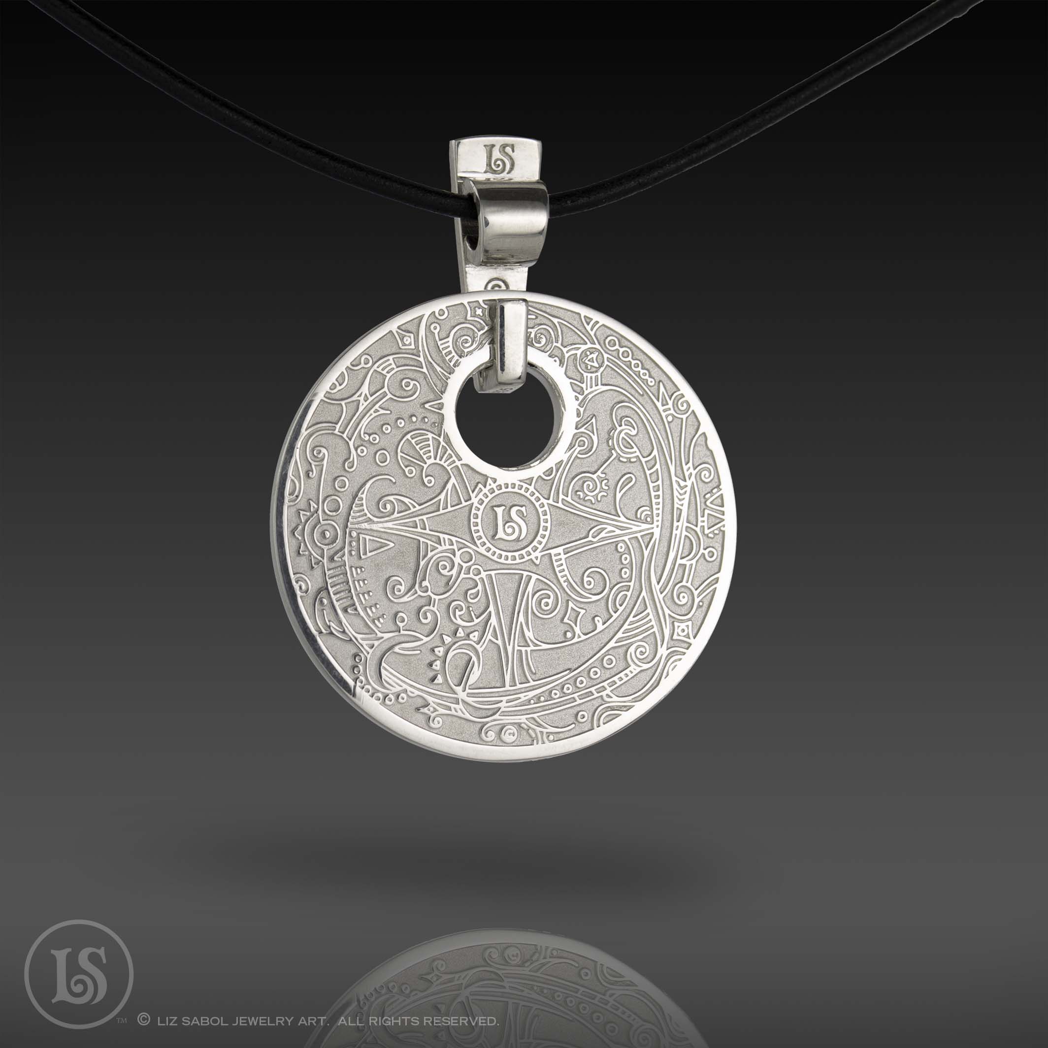 Solid sterling silver pendant with my Celestial Sun design in deep relief. Bail and 20" Leather cord included. Polishing cloth included. Other lengths available by request.