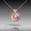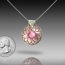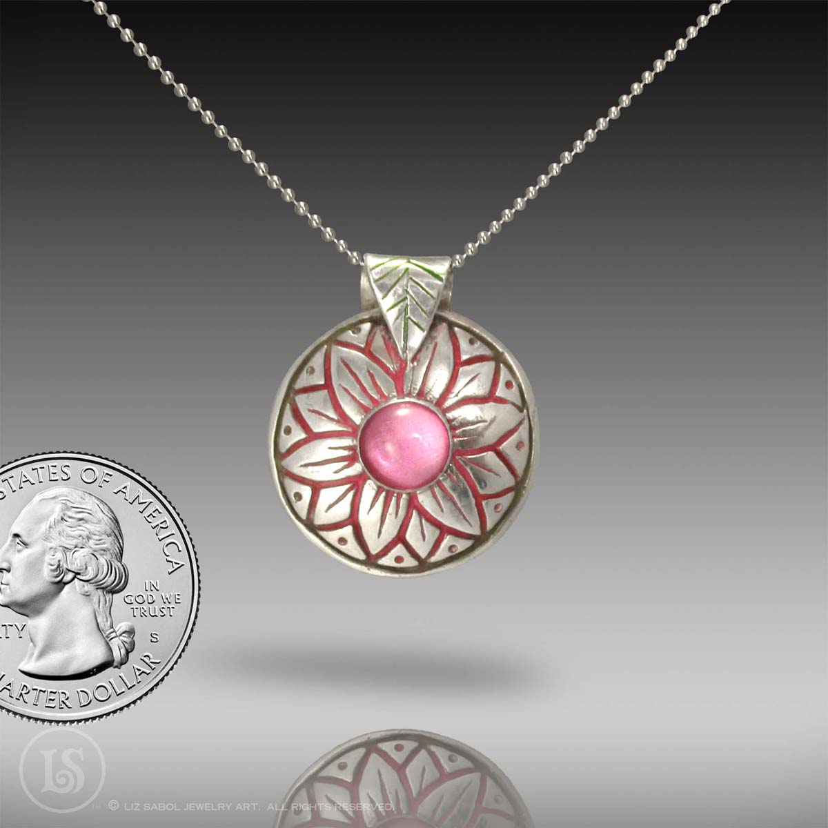 This pendant is hand-crafted in 999 fine silver metal clay.  The details, created from a hand-carved wax mold are highlighted with oil paint.  A 8mm lab-grown pink Sapphire is in the center of the flower.