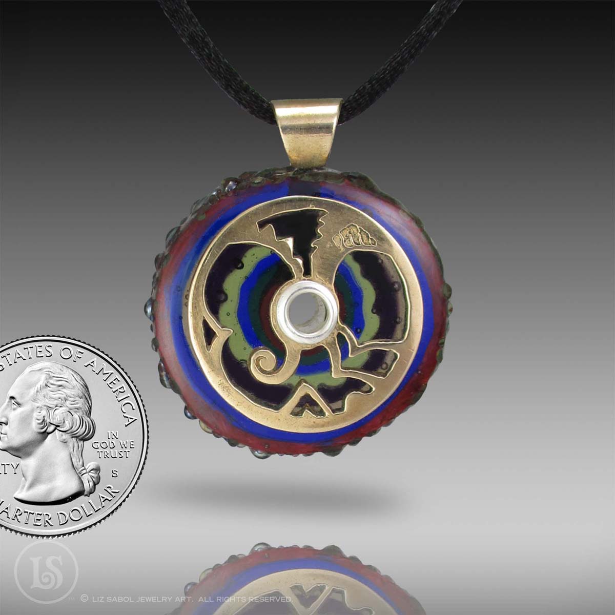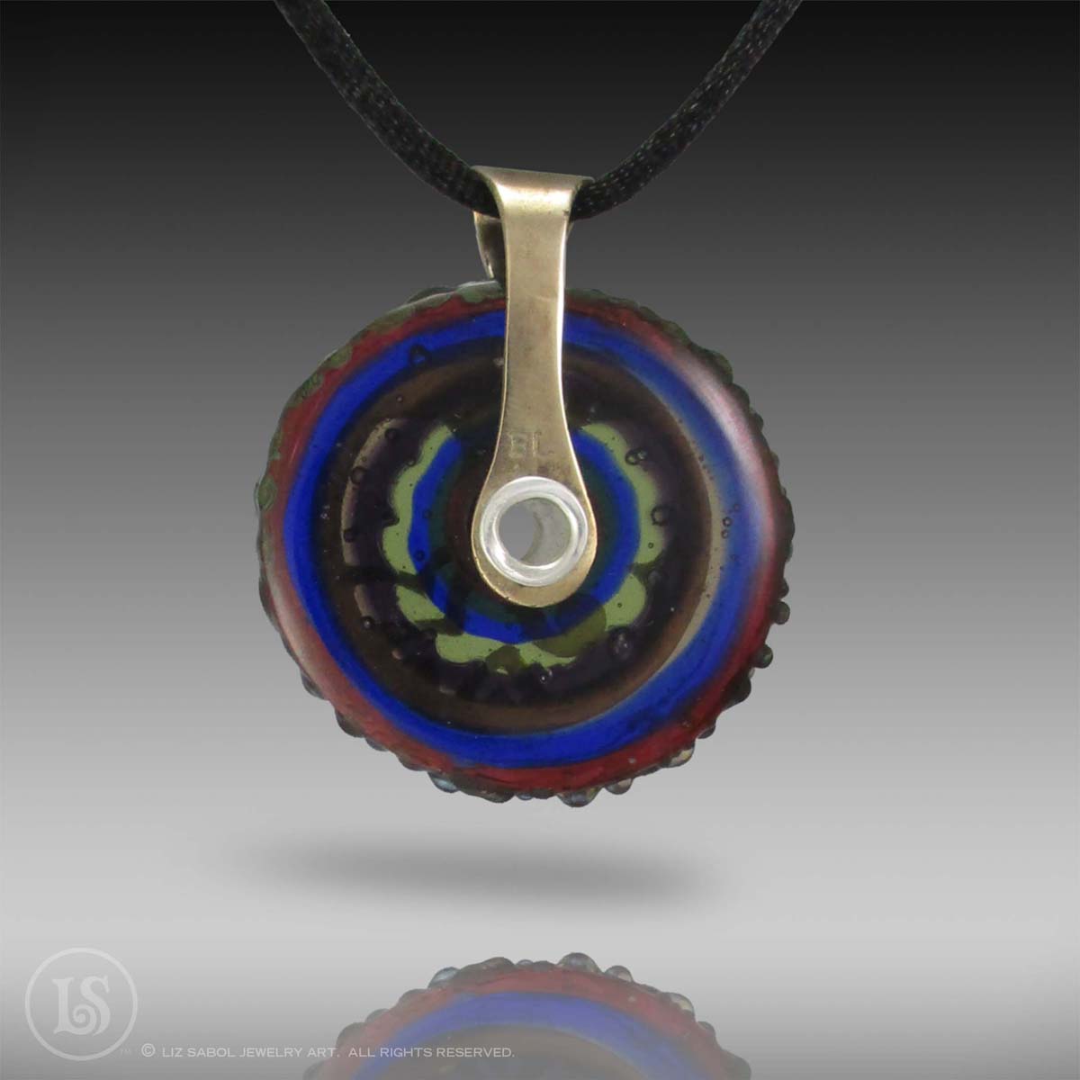 This pendant features one of my lampworked glass bead that I cold-worked to into a disc, to highlight the translusent bands of colors. This one-of-a-kind pendant is crafted in bronze metal clay and lampworked glass. A fine silver tube rivet attaches the pieces together.