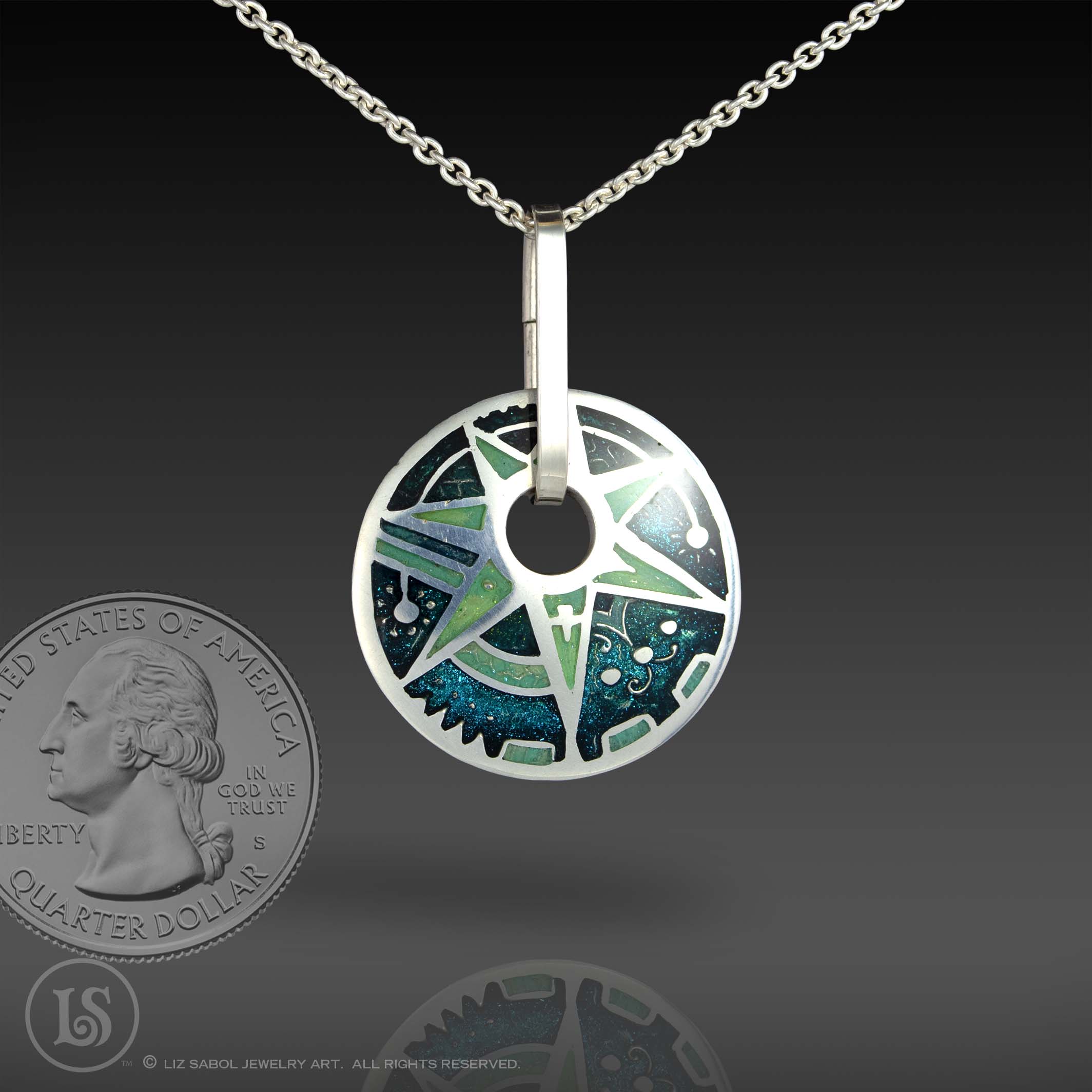This pendant is hand-crafted in 960 sterling silver metal clay, hand-painted and filled with resin. The resin is sanded flush and re-polished.