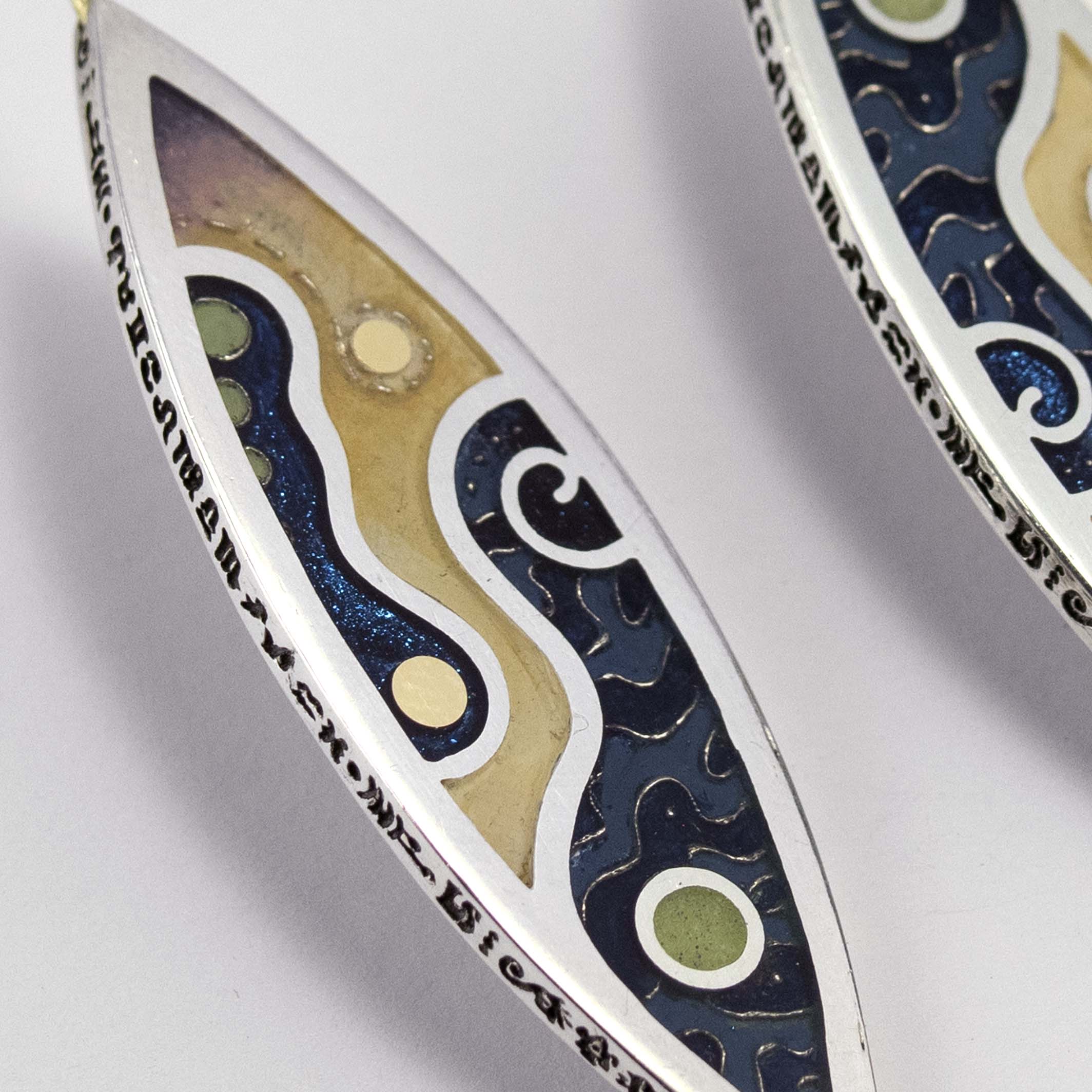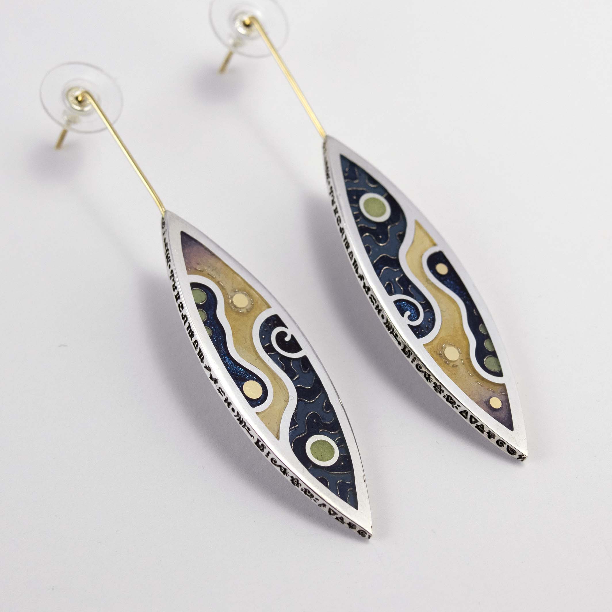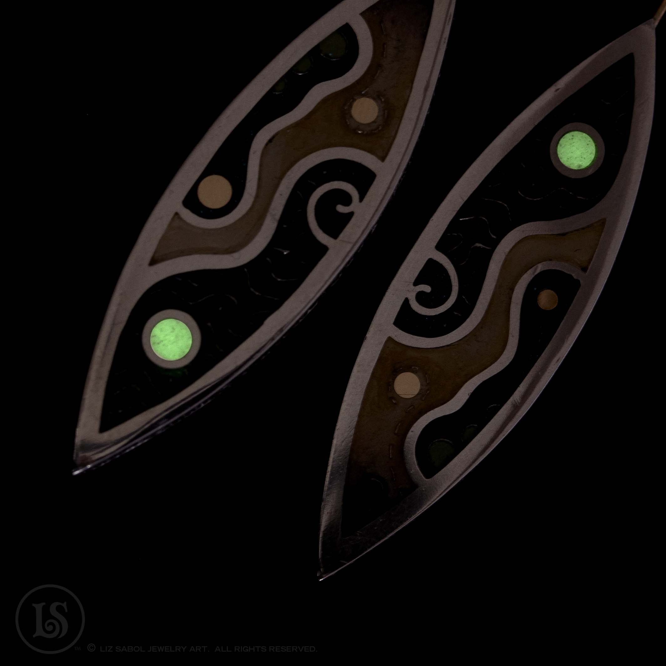These earrings are hand-crafted from 950 sterling silver metal clay, with 14k gold accents and 14k gold earwires. Hand-painted and resin champleve. This is one of the pieces of the collection that placed 2nd in the 2019 Saul Bell Design Award. JUPITER: Inspired by images captured by NASA's Juno mission to Jupiter. Jupiter's auroras interpreted with glow-in-the-dark accents. Hand-painted Champleve - oil paint and resin on 950 sterling with 14K gold accents.