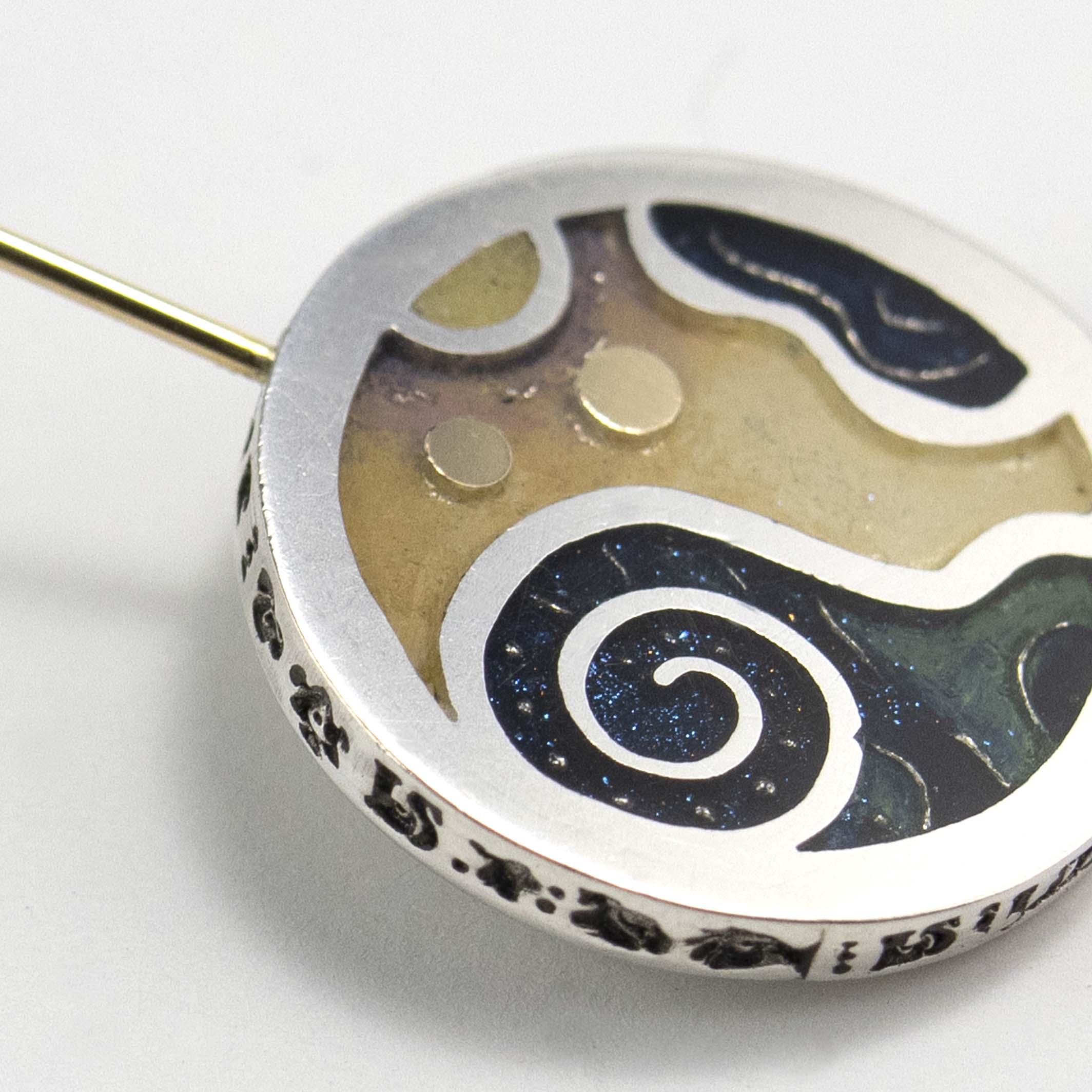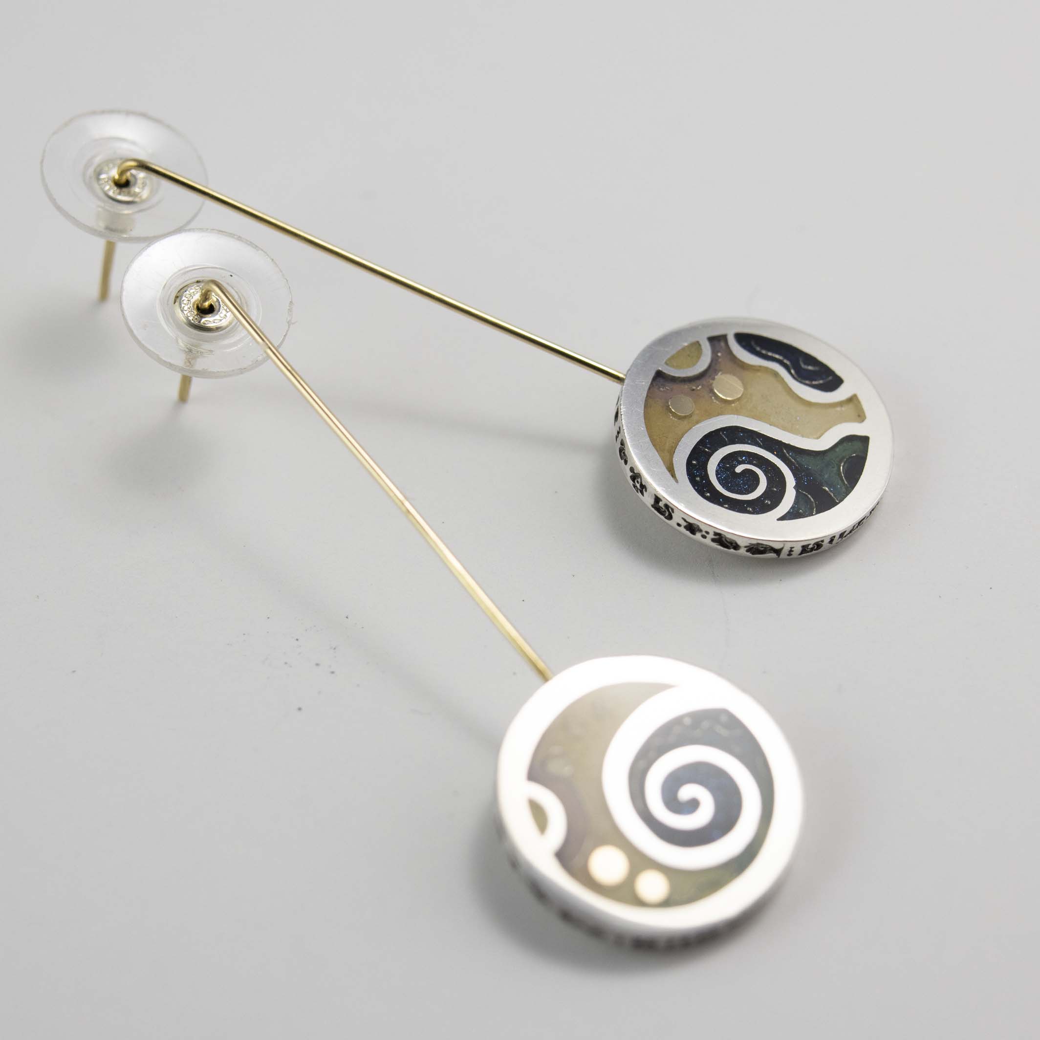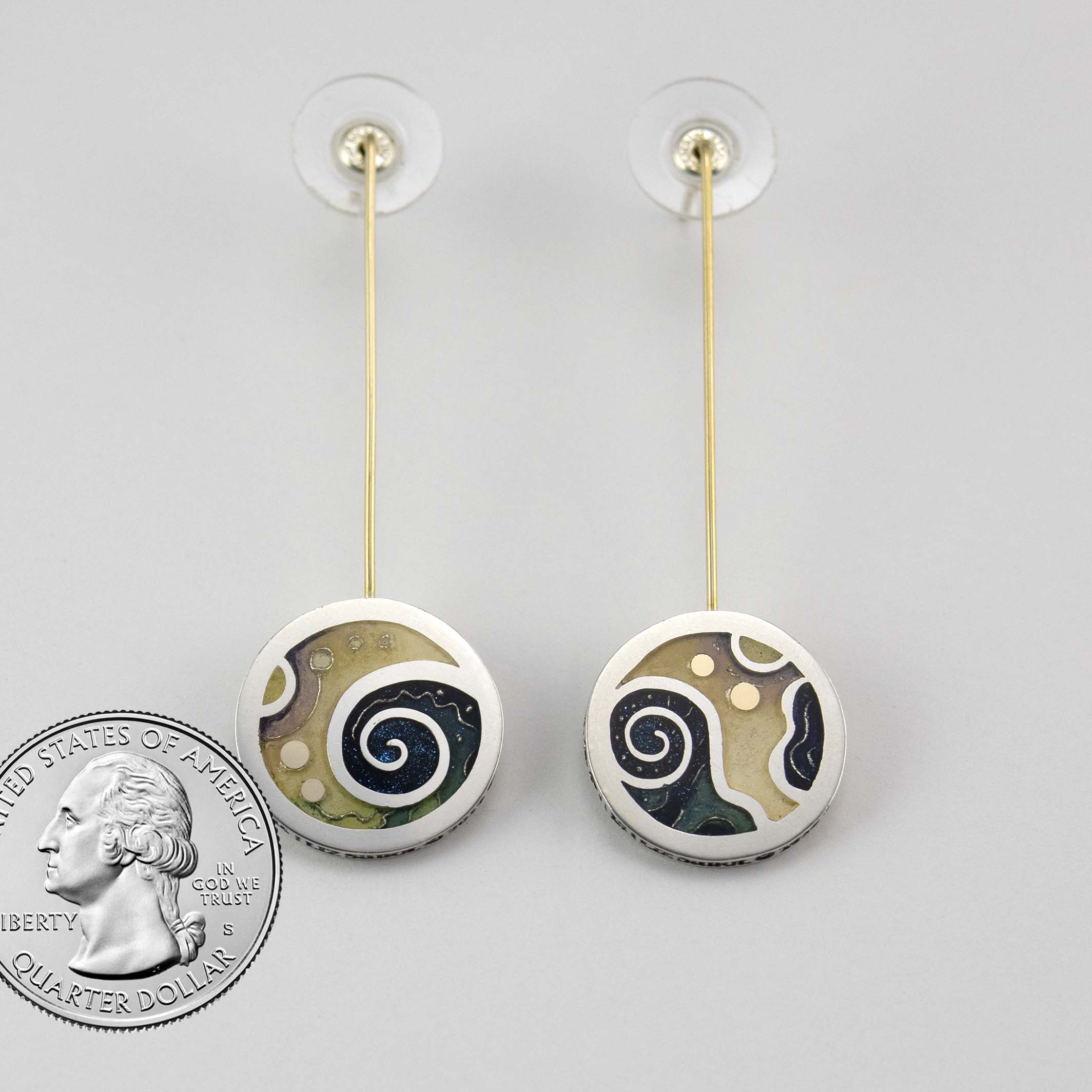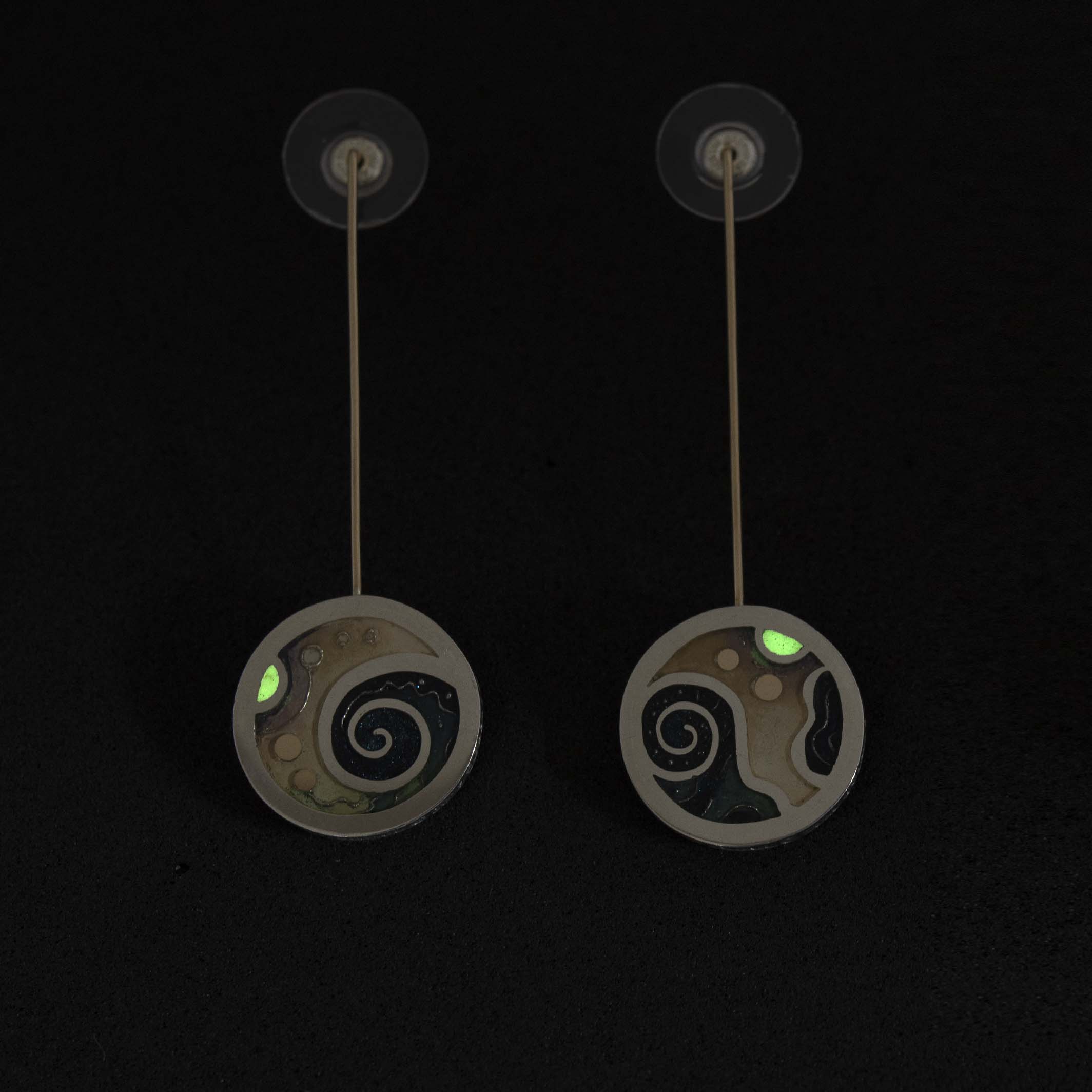 These earrings are hand-crafted from 950 sterling silver metal clay, with 14k gold accents and 14k gold earwires. Hand-painted and resin champleve. This is one of the pieces of the collection that placed 2nd in the 2019 Saul Bell Design Award. JUPITER: Inspired by images captured by NASA's Juno mission to Jupiter. Jupiter's auroras interpreted with glow-in-the-dark accents. Hand-painted Champleve - oil paint and resin on 950 sterling with 14K gold accents.