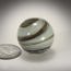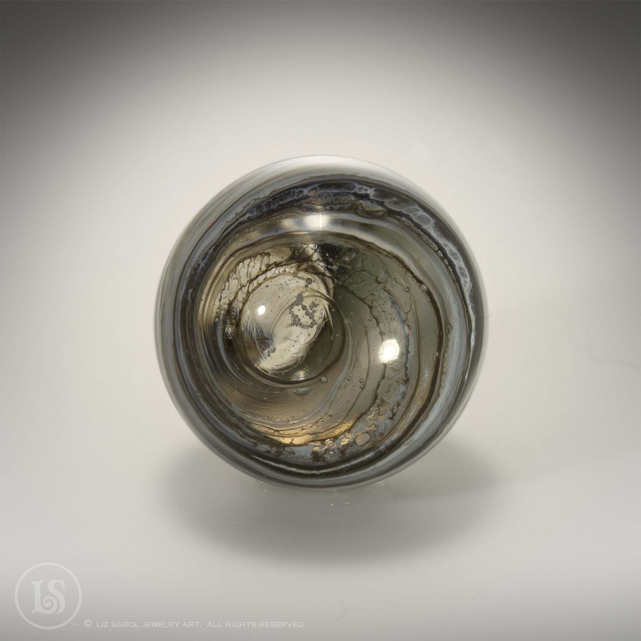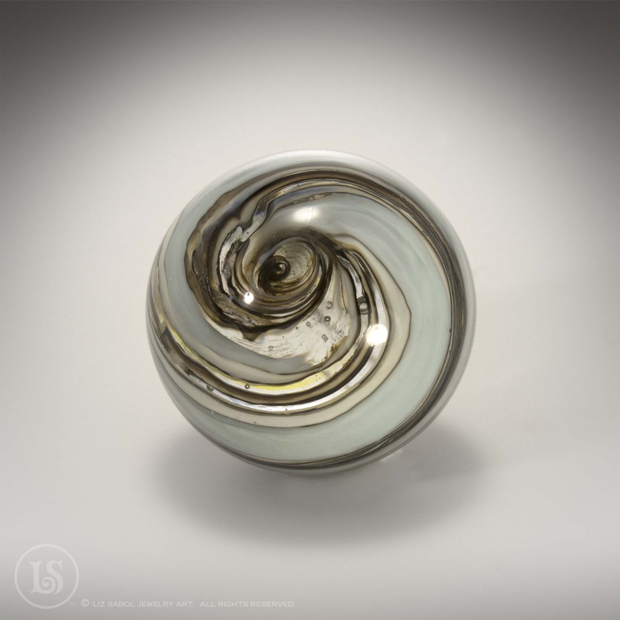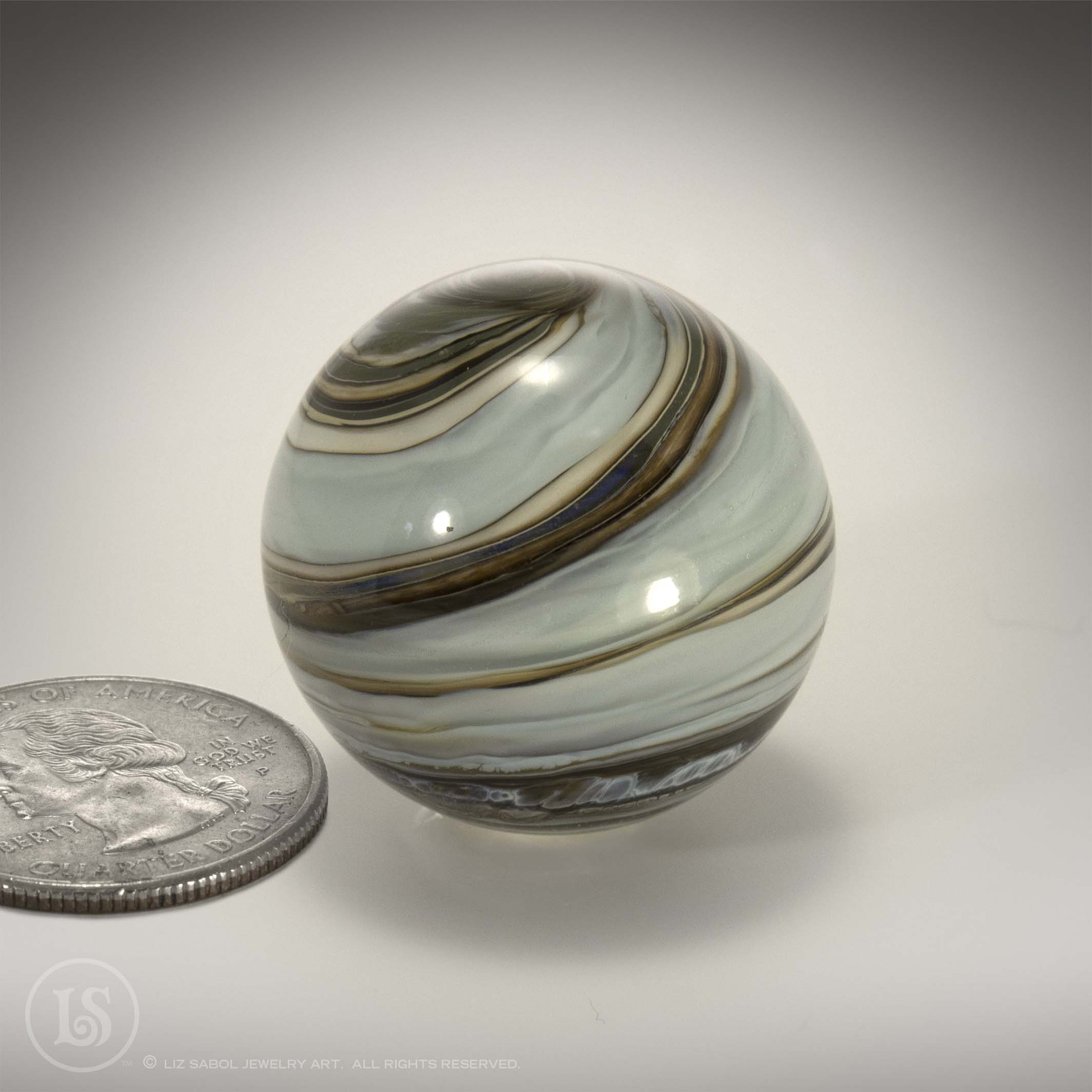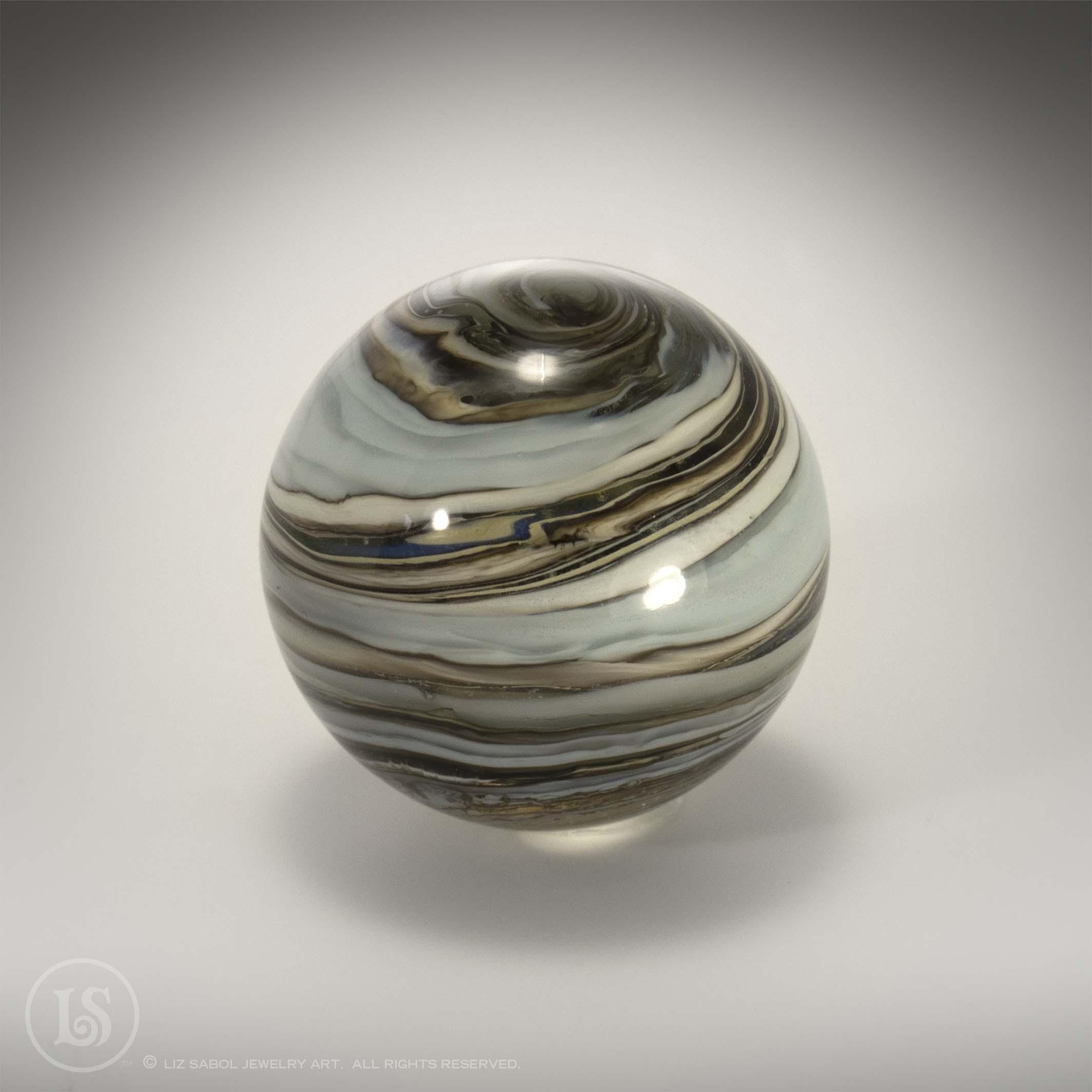 Hand-made one-of-a-kind lampworked glass marble. Signed LS on the bottom with titanium pen. A simple plastic stand is included. Hand-made bronze stands are available for purchase.