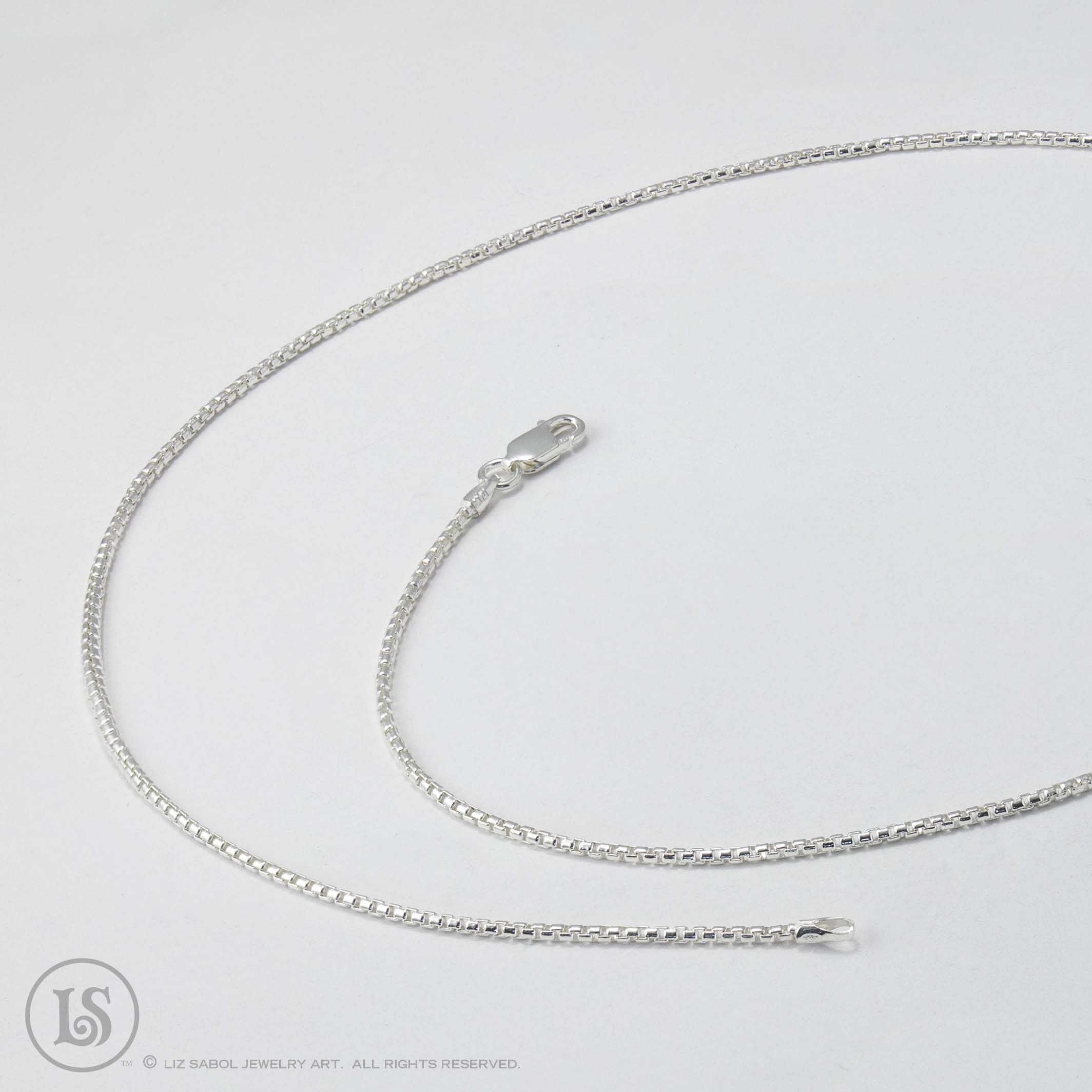 Rounded box chain, sterling silver. 1.5mm wide. 18 Inches long. Slim end allows the chain to fit through smaller bails than standard ring ends. Pendant NOT included, shown for example only.