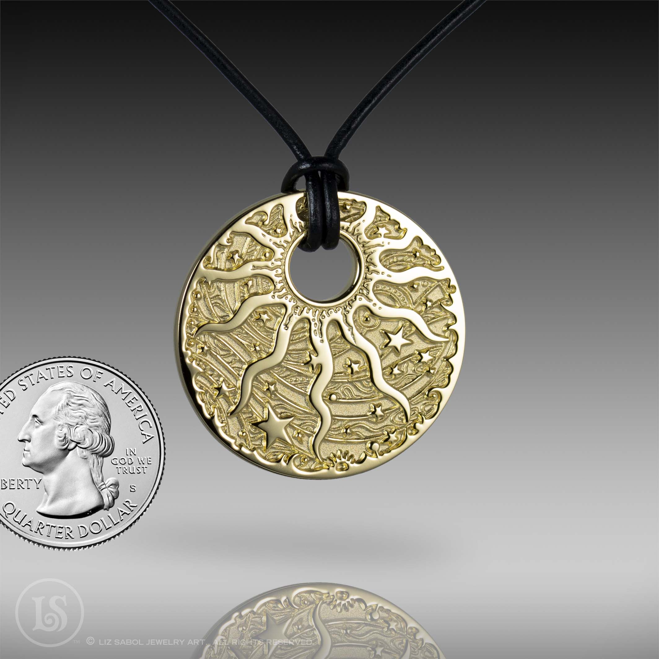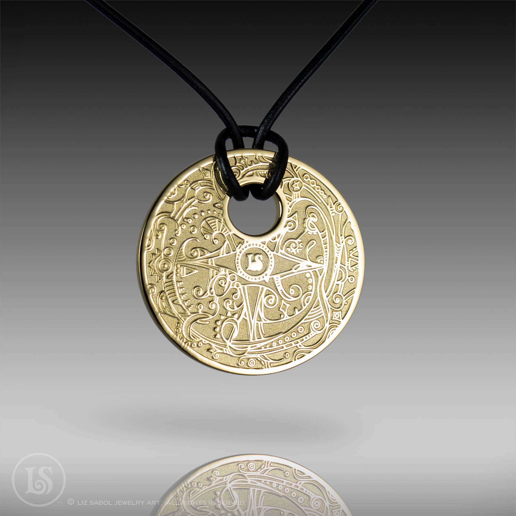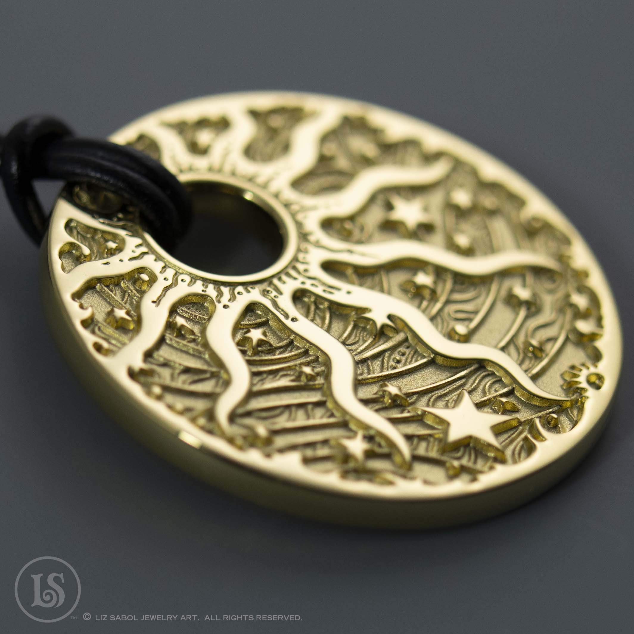 18K Gold-plated solid brass pendant with my Celestial Sun design in deep relief. The back features my intricate compass rose design. 18" black leather cord included. 1.25" diameter. 3mm thick. 18" Leather cord with sterling clasp included.