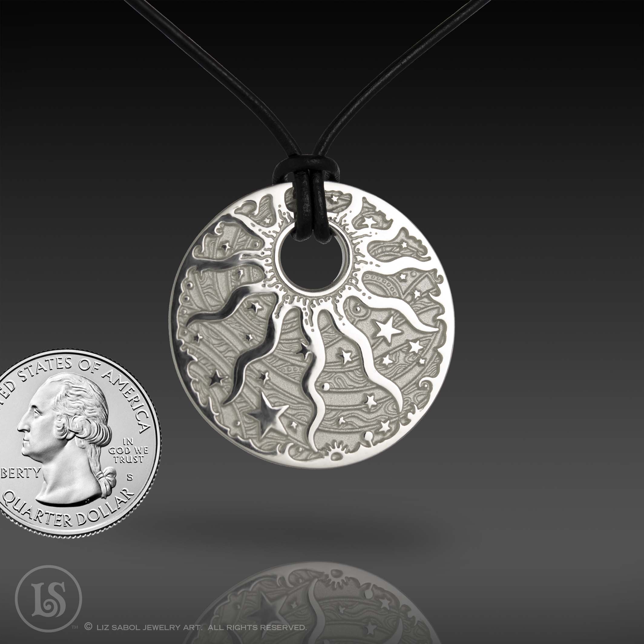 Solid sterling silver pendant with my Celestial Sun design in deep relief. 18" Leather cord included. Polishing cloth included.