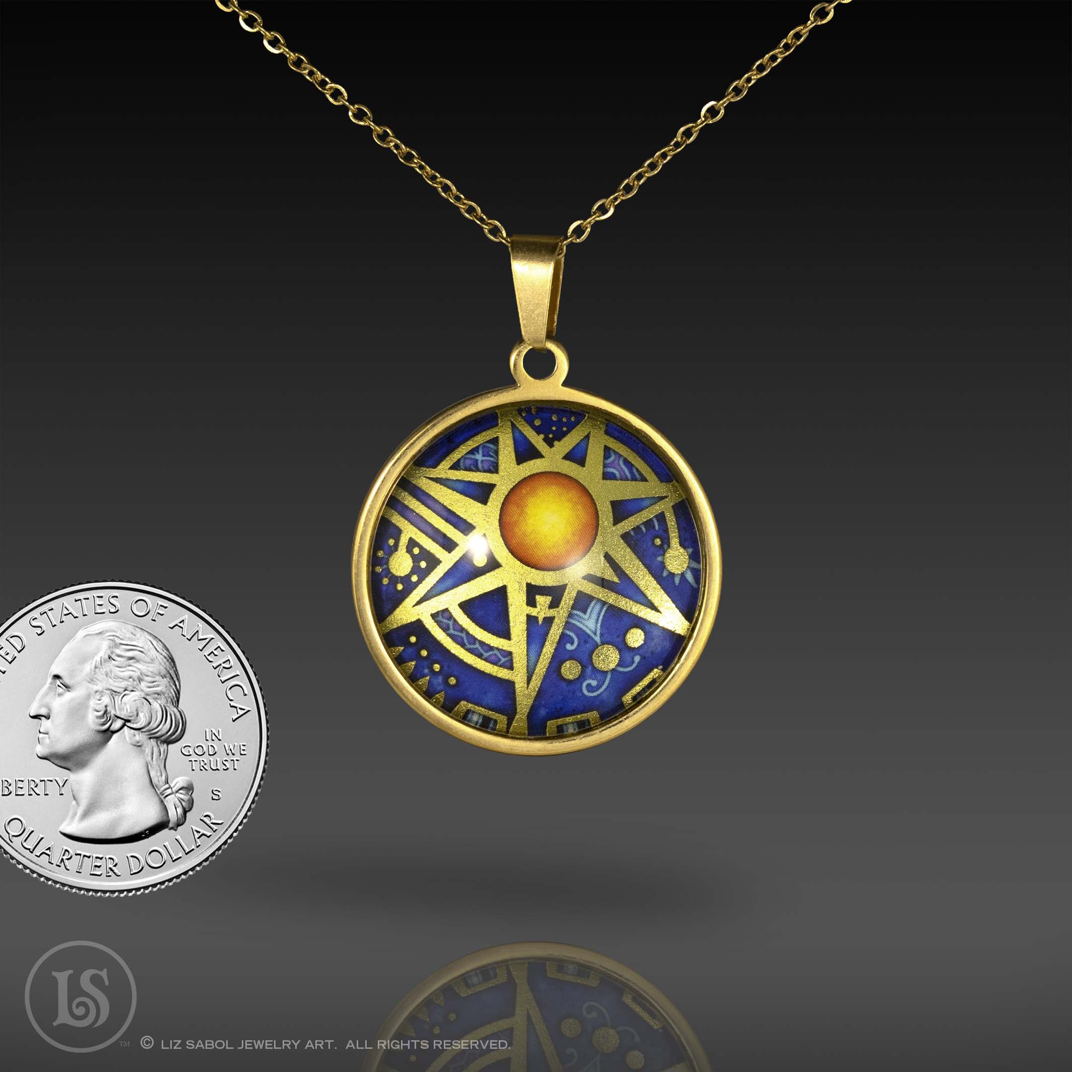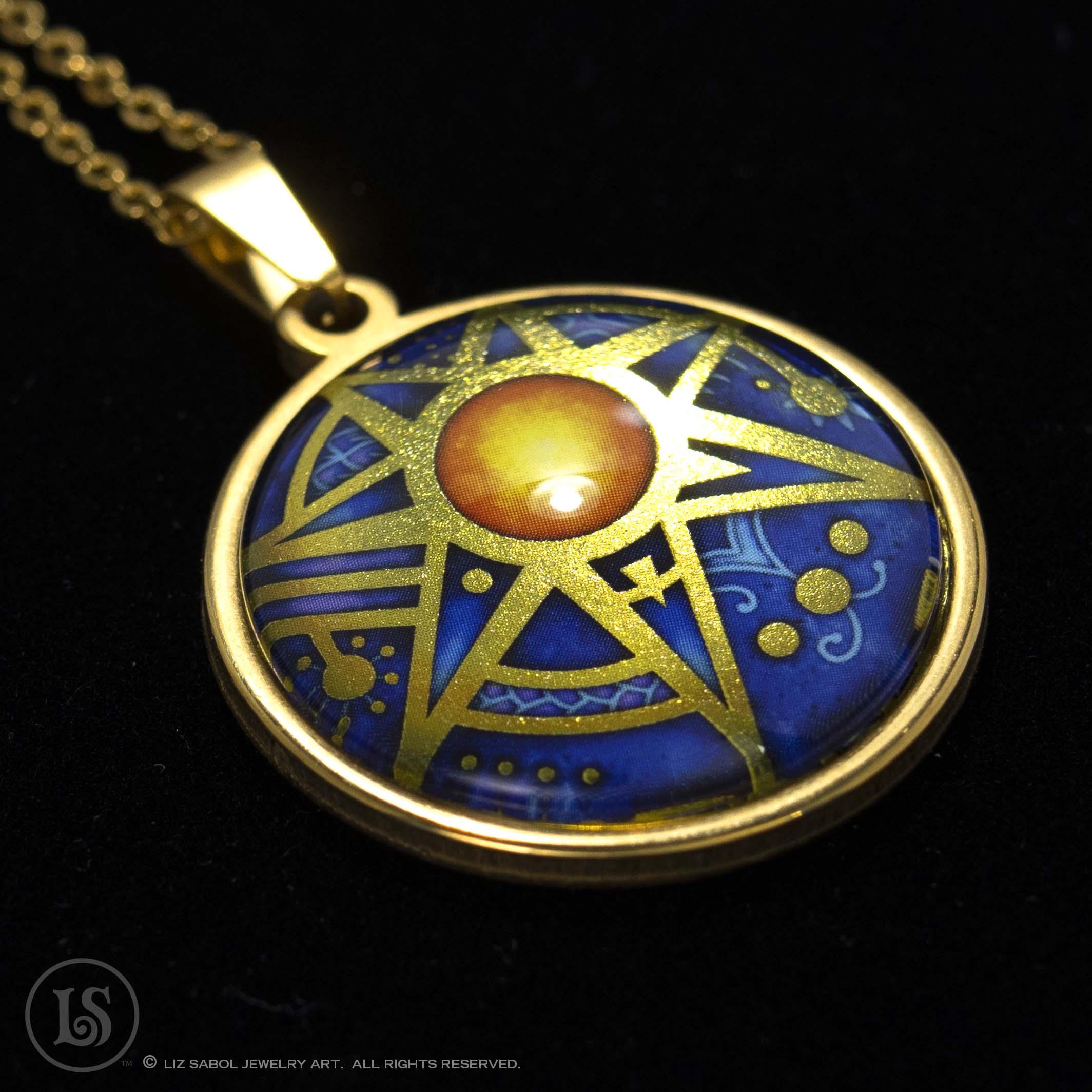 This is a high-quality reproduction in ink and foil of my popular handmade champleve Star Fire design, mounted on stainless steel and covered in solid glass. Affordable for everyone. Gold-plated. Comes with a stainless steel chain.