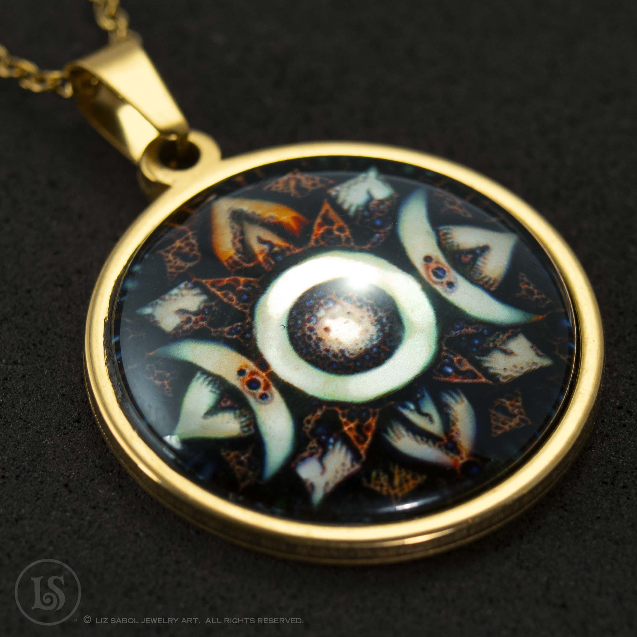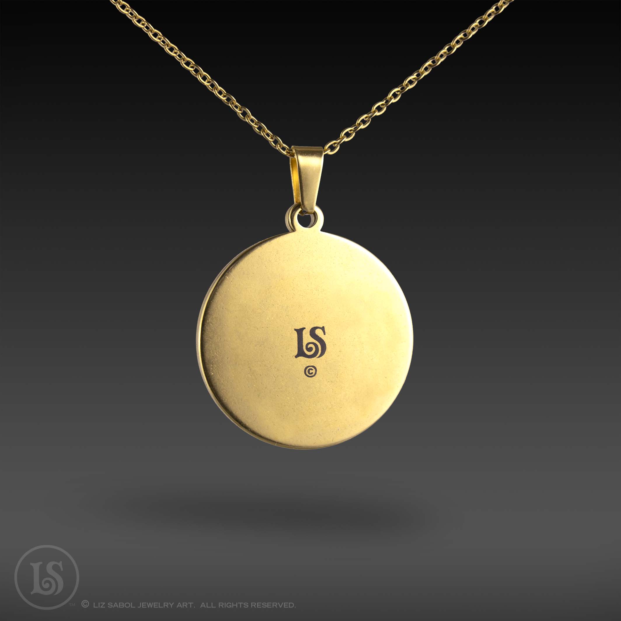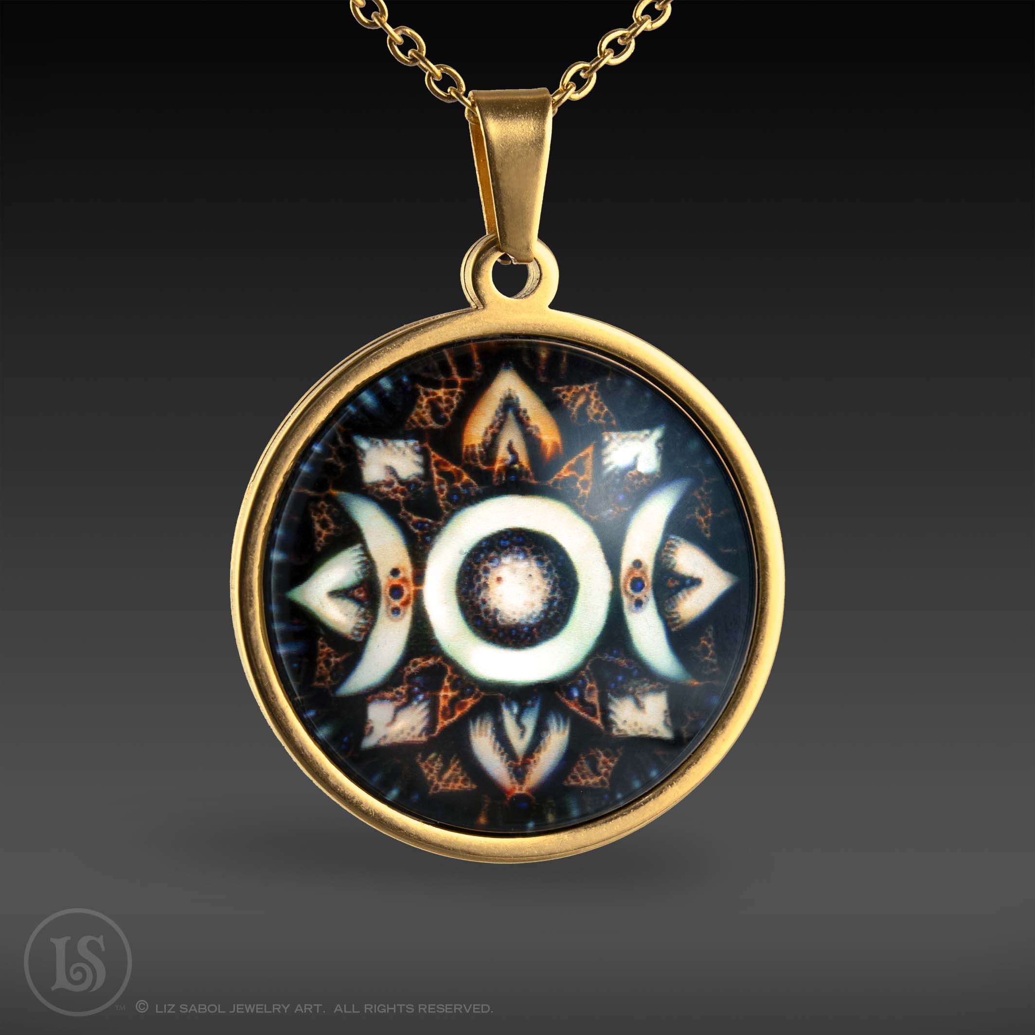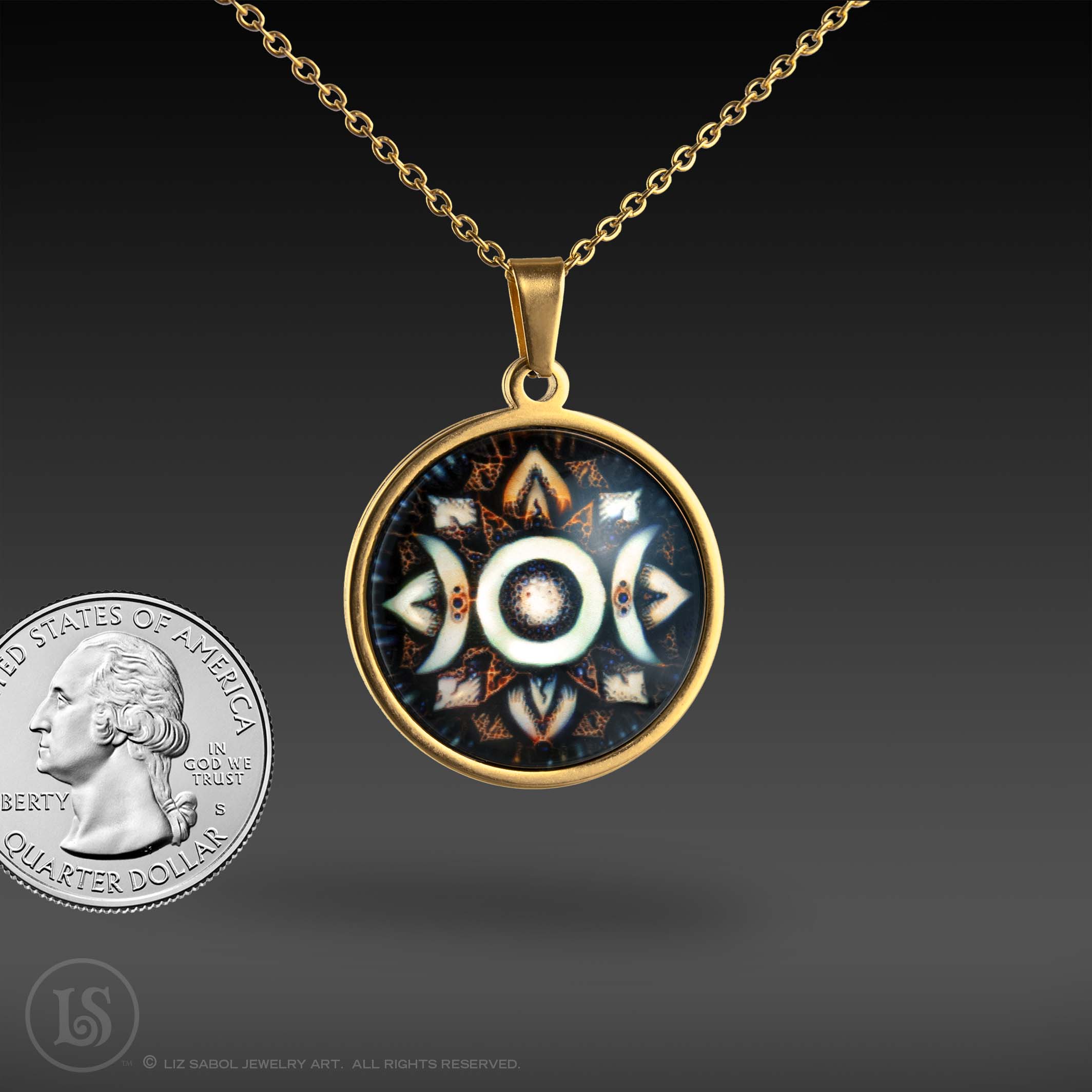 This is a high-quality reproduction in Giclee, archival fine-art print, with a mother-of-pearl shimmer, of my triple goddess, or triple moon illustration, enhanced with artificial intelligence/machine learning techniques, mounted on stainless steel and covered in solid glass. Affordable for everyone. Available in gold-plated. Comes with a stainless steel chain.