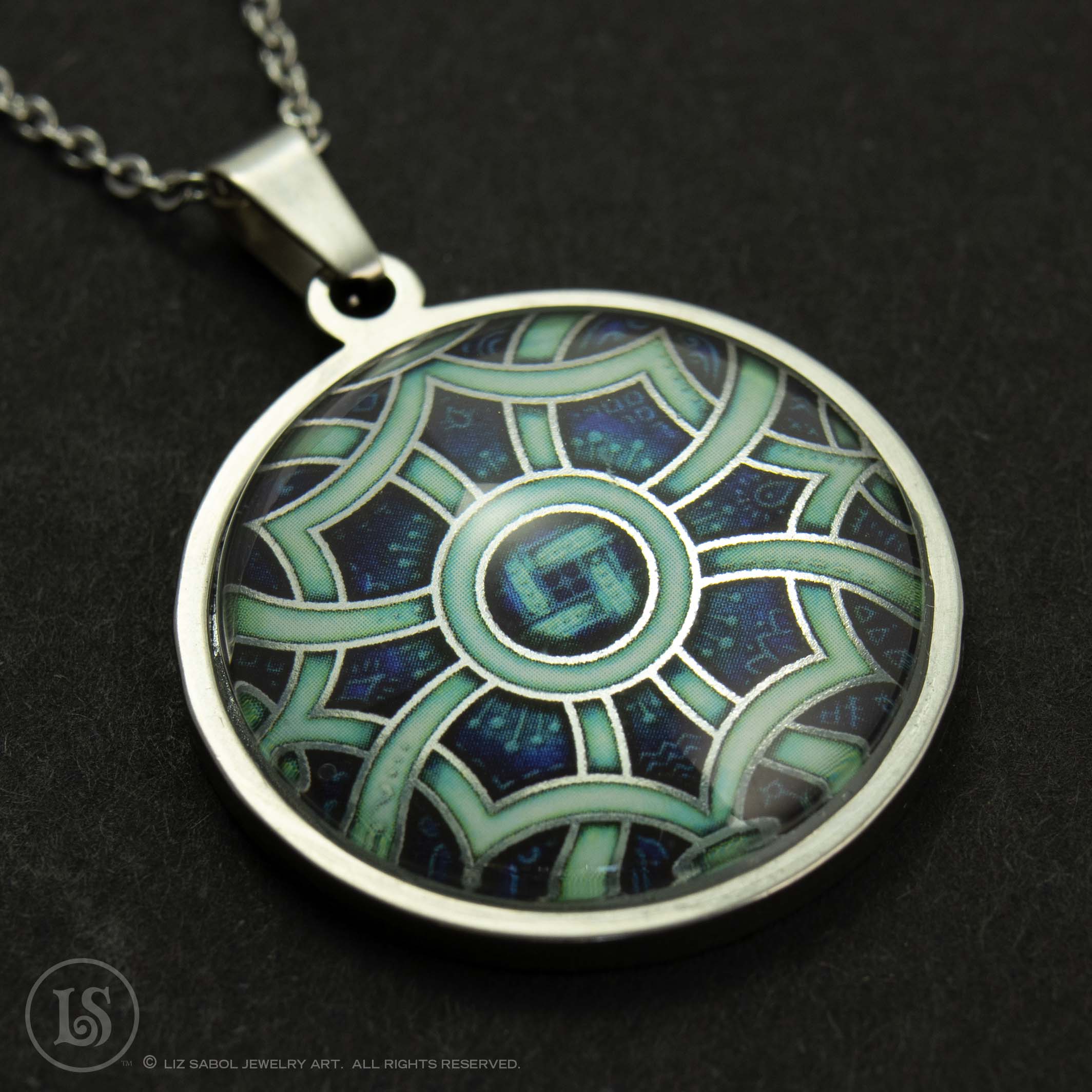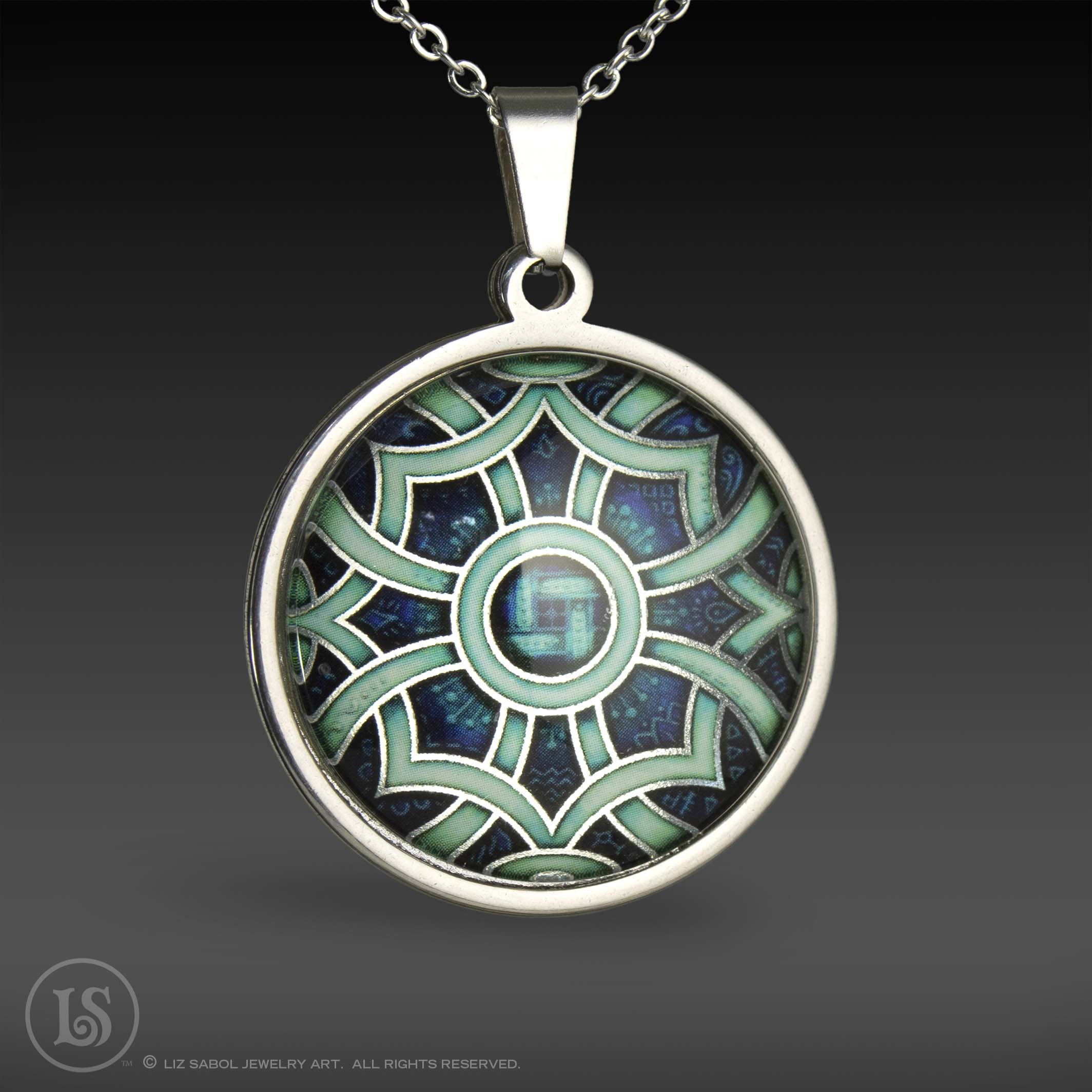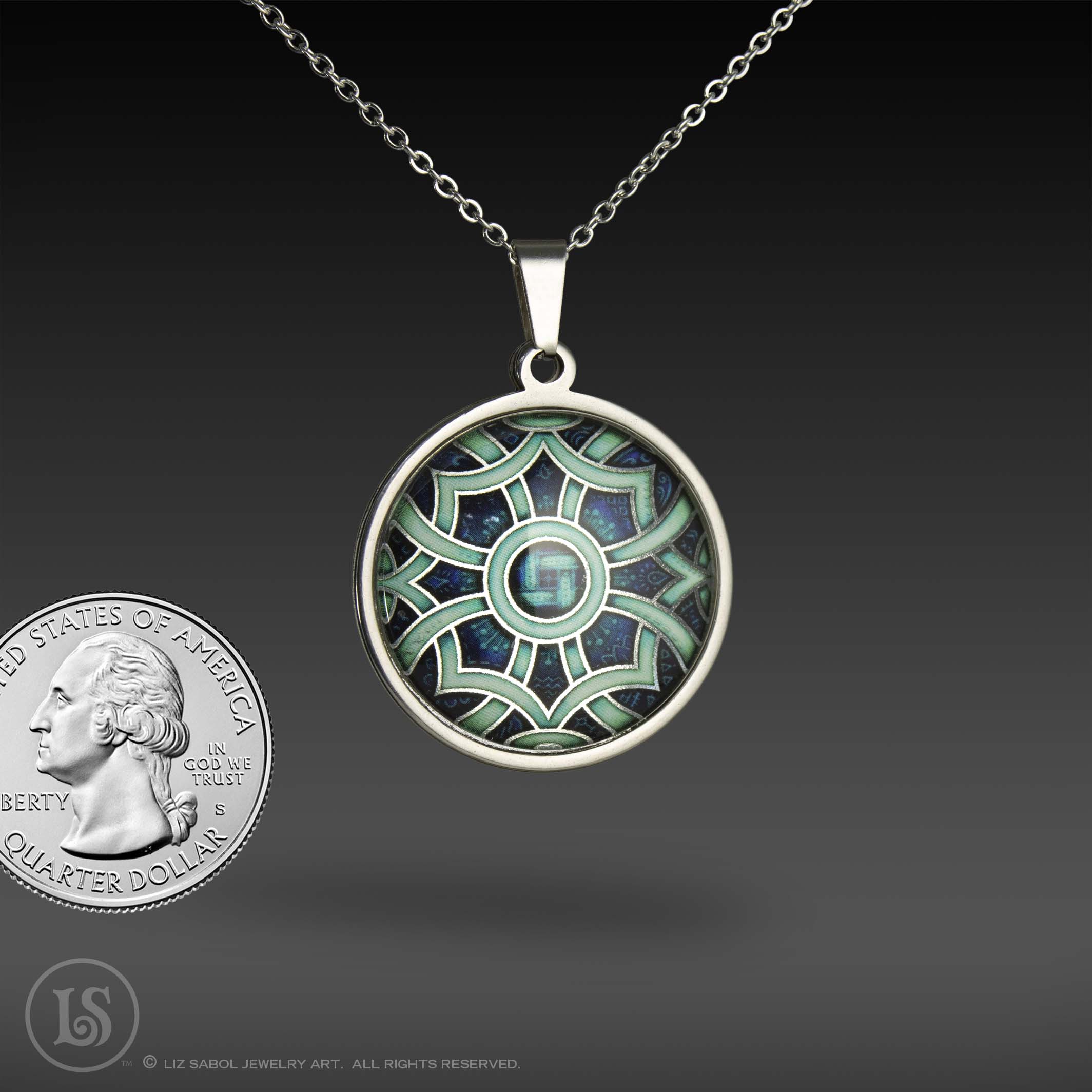 This is a high-quality reproduction in ink and foil of my popular award-winning Dreamweaver champleve design, mounted on stainless steel and covered in solid glass. Affordable for everyone. Comes with a stainless steel chain.