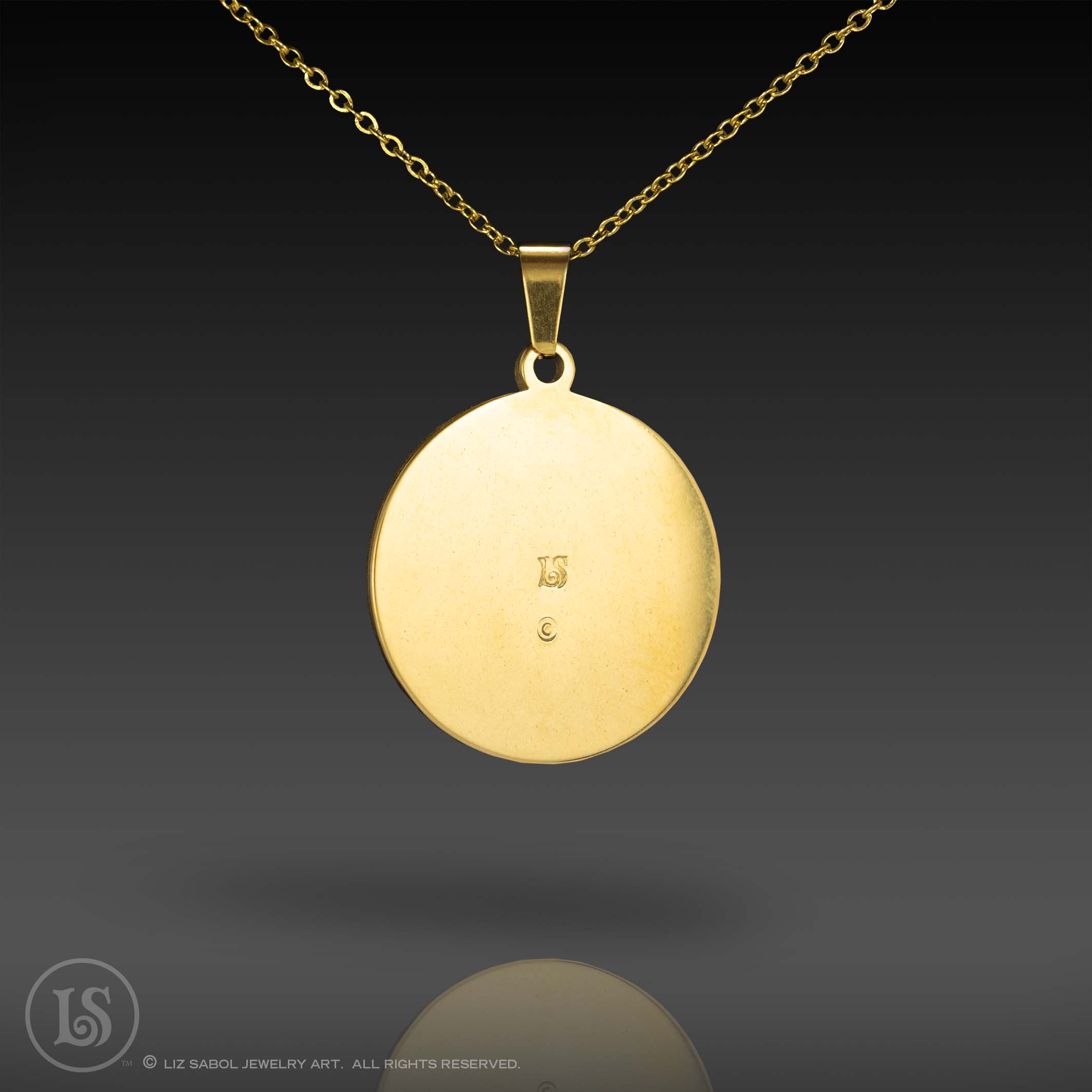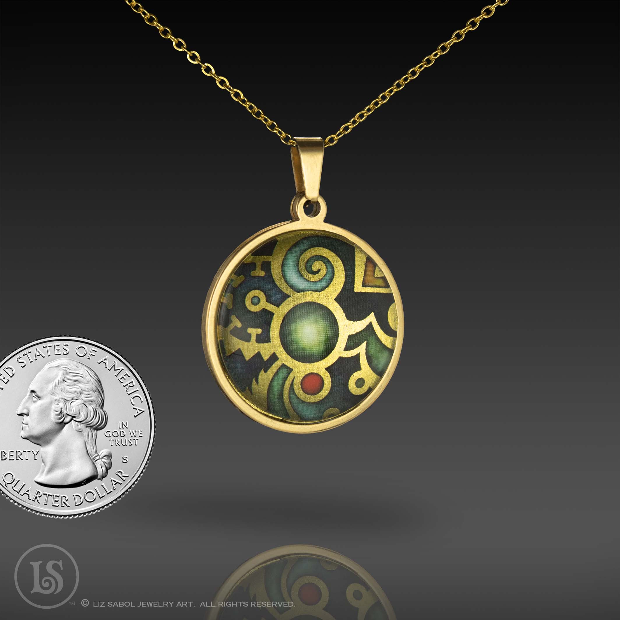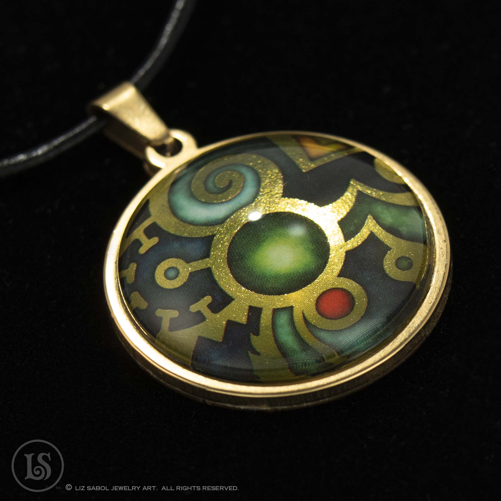 This is a high-quality reproduction in ink and foil of my popular handmade champleve Paisley design, mounted on stainless steel and covered in solid glass. Affordable for everyone. Gold-plated. Comes with a stainless steel chain.