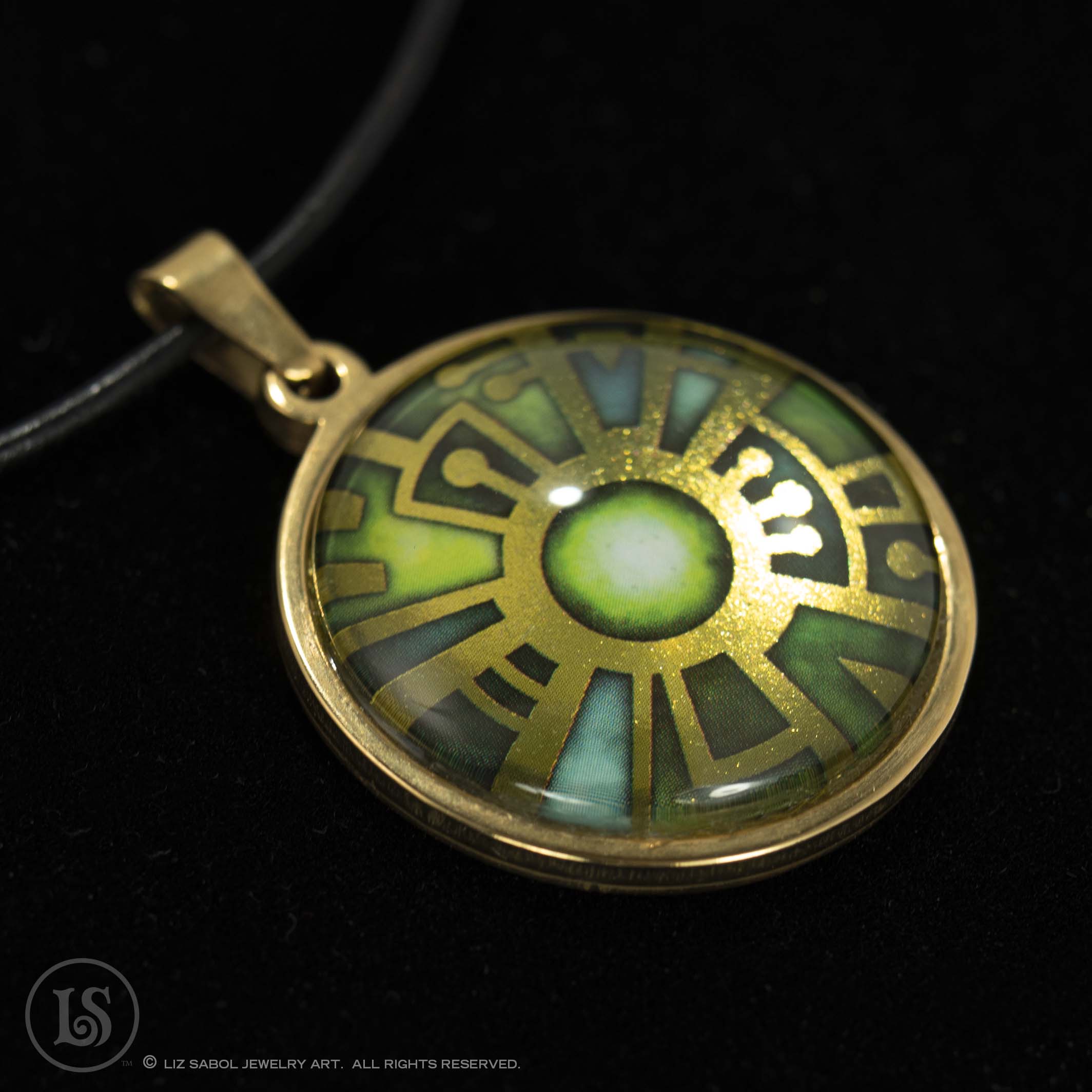 This is a high-quality reproduction in ink and foil of my popular handmade champleve Radial design, mounted on stainless steel and covered in solid glass. Affordable for everyone. Gold-plated. Comes with a stainless steel chain.